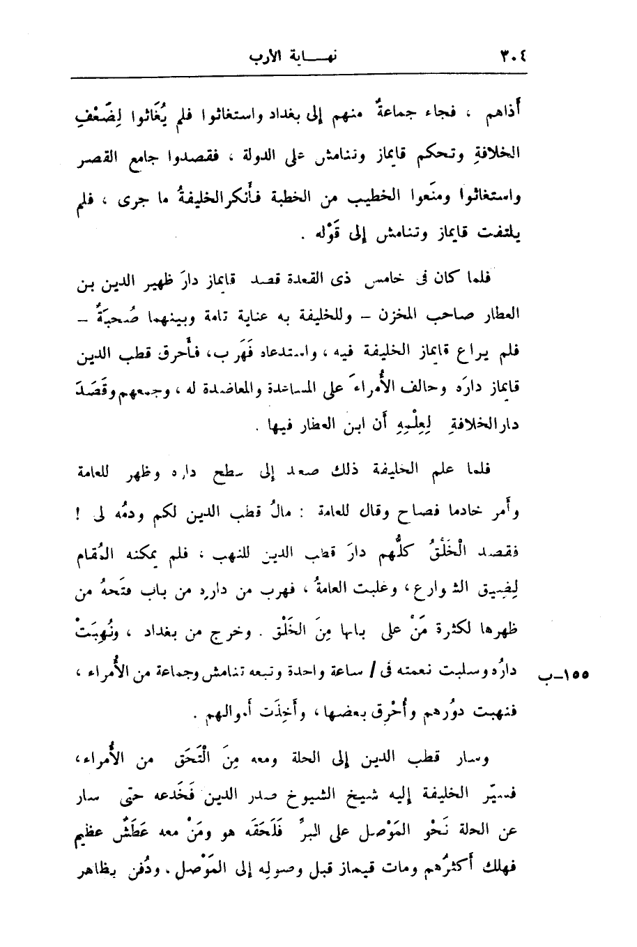 فلما علم الخليفة ذلك صعد إلى سطح داره وظهر للعامة وأمر خادما فصاح وقال للعامة: مال قطب الدين لكم ودمه لى! فقصد الخلق كلّهم دار قطب الدين للنهب، فلم يمكنه المقام لضيق الشوارع، وغلبت العامة، فهرب من داره من باب فتحه من ظهرها لكثرة من على بابها من الخلق. وخرج من بغداد، ونهبت داره وسلبت نعمته فى/ ساعة واحدة وتبعه تنامش وجماعة من الأمراء، فنهبت دورهم وأحرق بعضها، وأخذت أموالهم.