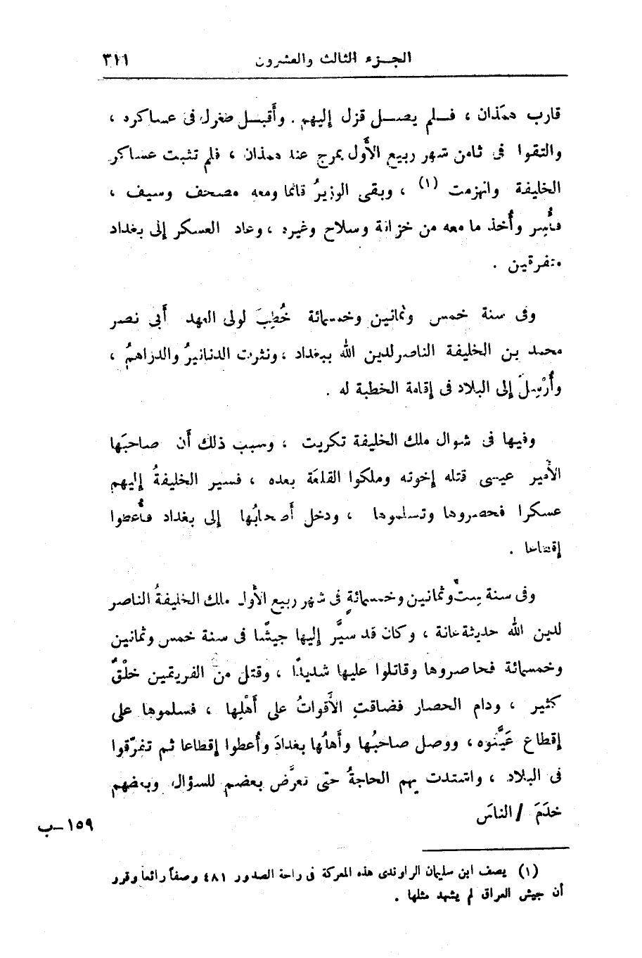 قارب همذان، فلم يصل قزل إليهم. وأقبل طغرل فى عساكره، والتقوا فى ثامن شهر ربيع الأول بمرج عند همذان، فلم تثبت عساكر الخليفة وانهزمت «1» ، وبقى الوزير قائما ومعه مصحف وسيف، فأسر وأخذ ما معه من خزانة وسلاح وغيره، وعاد العسكر إلى بغداد متفرقين.