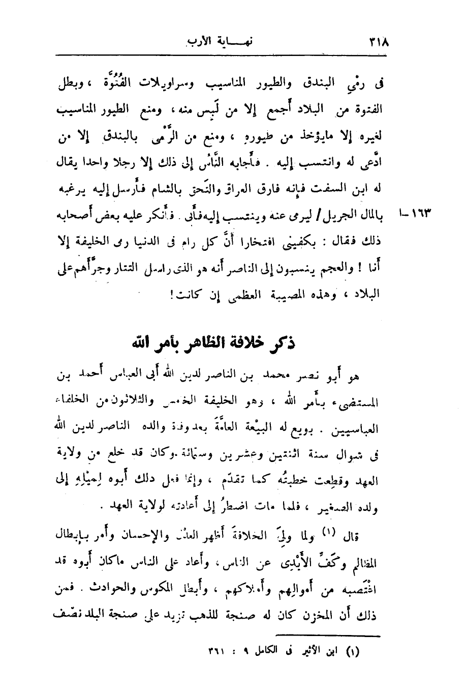 فى رمى البندق والطيور المناسيب وسراويلات الفتوّة، وبطل الفتوة من البلاد أجمع إلا من لبس منه، ومنع الطيور المناسيب لغيره إلا ما يؤخذ من طيوره، ومنع من الرّمى بالبندق إلا من ادّعى له وانتسب إليه. فأجابه النّاس إلى ذلك إلا رجلا واحدا يقال له ابن السفت فإنه فارق العراق والنحق بالشام فأرسل إليه يرغبه بالمال الجريل/ ليرمى عنه وينتسب إليه فأبى. فأنكر عليه بعض أصحابه ذلك فقال: يكفينى افتخارا أنّ كل رام فى الدنيا رمى الخليفة إلا أنا! والعجم ينسبون إلى الناصر أنه هو الذى راسل التتار وجرّأهم على البلاد، وهذه المصيبة العظمى إن كانت!