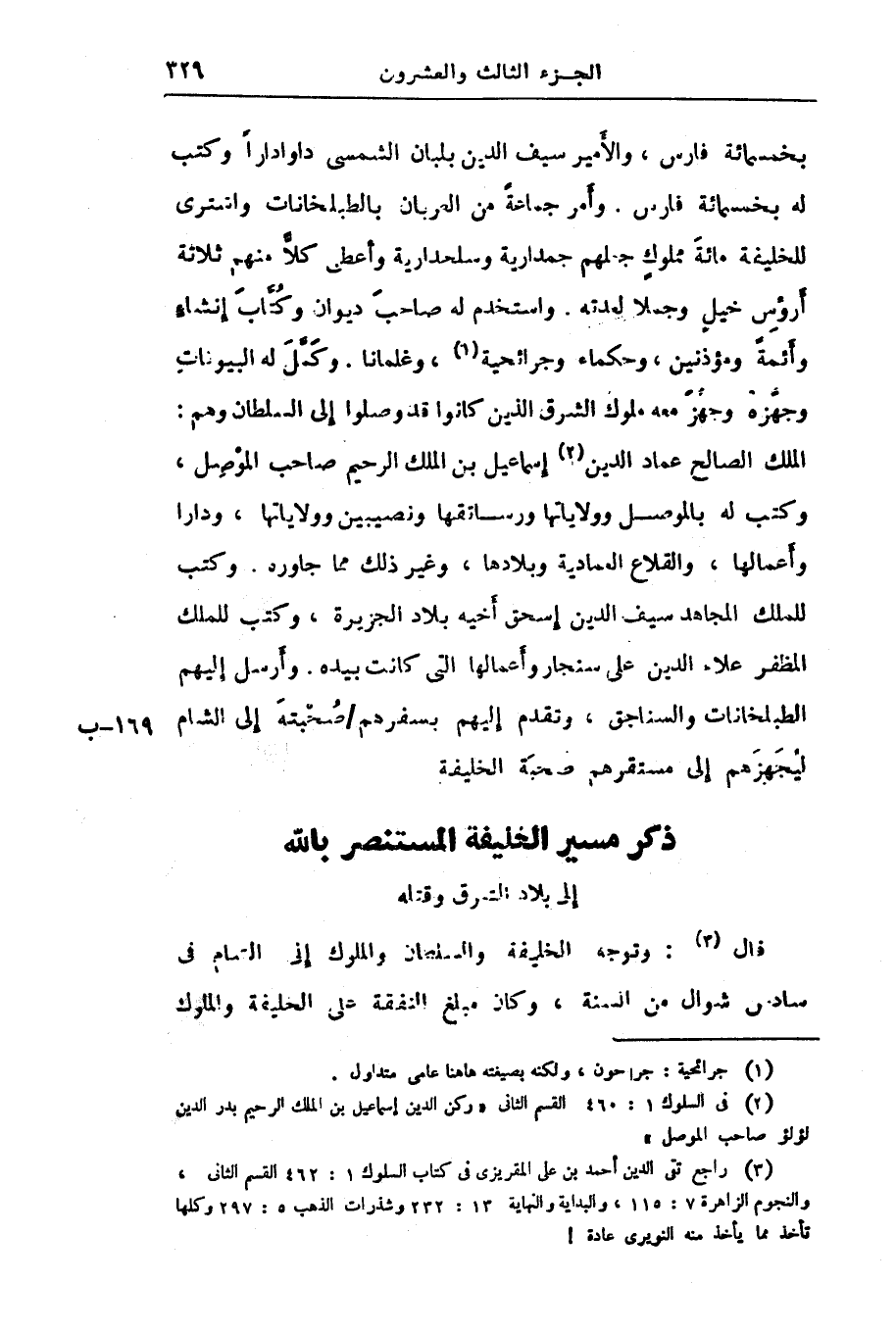 بخمسمائة فارس، والأمير سيف الدين بلبان الشمسى داوادارا وكتب له بخمسمائة فارس. وأمر جماعة من العربان بالطبلخانات واشترى للخليفة مائة مملوك جعلهم جمدارية وسلحدارية وأعطى كلّا منهم ثلاثة أرؤس خيل وجملا لعدته. واستخدم له صاحب ديوان وكتّاب إنشاء وأئمة ومؤذنين، وحكماء وجرائحية «1» ، وغلمانا. وكمّل له البيونات وجهّزه وجهّز معه ملوك الشرق الذين كانوا قد وصلوا إلى السلطان وهم:
