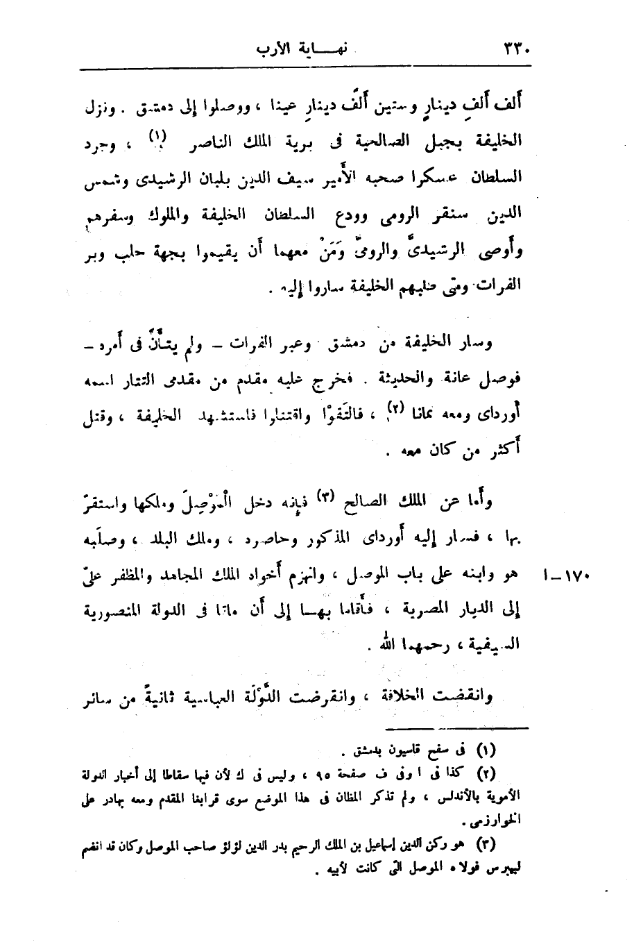 وسار الخليفة من دمشق وعبر الفرات- ولم يتأنّ فى أمره- فوصل عانة والحديثة. فخرج عليه مقدم من مقدمى التتار اسمه أورداى ومعه بمانا «2» ، فالتقوا واقتتلوا فاستشهد الخليفة، وقتل أكثر من كان معه.