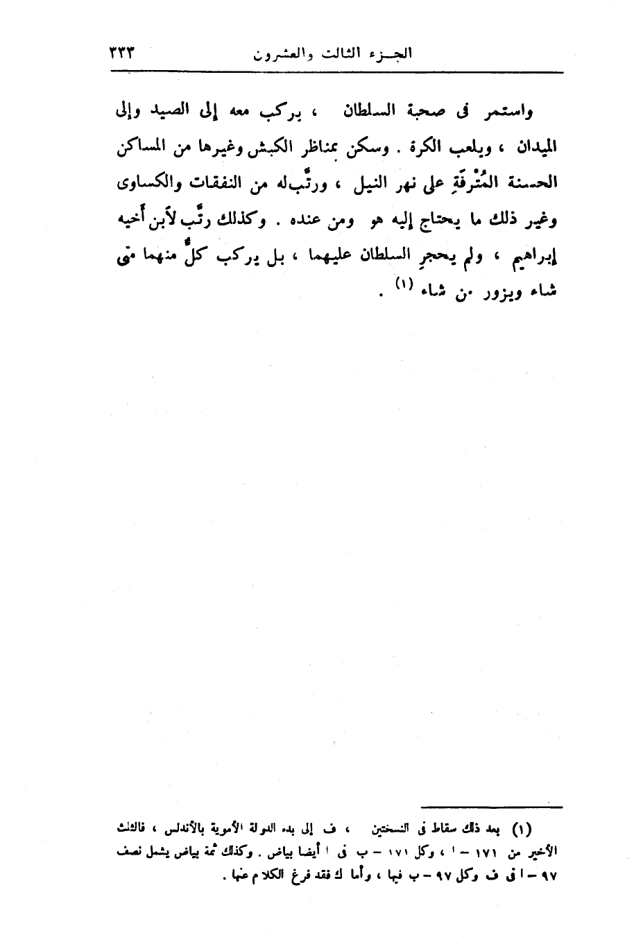 واستمر فى صحبة السلطان، يركب معه إلى الصيد وإلى الميدان، ويلعب الكرة. وسكن بمناظر الكبش وغيرها من المساكن الحسنة المترفة على نهر النيل، ورتّب له من النفقات والكساوى وغير ذلك ما يحتاج إليه هو ومن عنده. وكذلك رتّب لابن أخيه إبراهيم، ولم يحجر السلطان عليهما، بل يركب كلّ منهما متى شاء ويزور من شاء «1» .