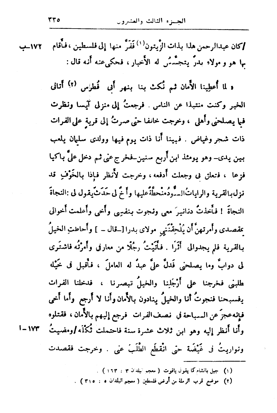 «لما أعطينا الأمان ثم نكث بنا بنهر أبى فطرس «2» أتانى الخبر وكنت منتبذا عن الناس. فرجعت إلى منزلى آيسا ونظرت فيما يصلحنى وأهلى، وخرجت خائفا حتى صرت إلى قرية على الفرات ذات شجر وغياض. فبينا أنا ذات يوم فيها وولدى سليمان يلعب بين يدى- وهو يومئذ ابن أربع سنين- فخرج عنى ثم دخل علىّ باكيا فزعا، فتعلق بى وجعلت أدفعه، وخرجت لأنظر فإذا بالخوف قد نزل بالقرية والرايات السّود منحطّة عليها وأخ لى حدث يقول لى: النجاة النجاة! فأخذت دنانير معى ونجوت بنفسى وأخى وأعلمت أخواتى بمقصدى وأمرتهنّ أن يلحقننى مولاى بدرا [- قال-] وأحاطت الخيل بالقرية فلم يجدوا لى أثرا. فأتيت رجلا من معارفى وأمرته فاشترى لى دوابّ وما يصلحنى فدلّ علىّ عبد له العامل، فأقبل فى خيله يطلبنى فخرجنا على أرجلنا والخيل تبصرنا، فدخلنا الفرات فسبحنا فنجوت أنا والخيل ينادون بالأمان وأنا لا أرجع وأما أخى فإنه عجز عن السباحة فى نصف الفرات فرجع إليهم بالأمان، فقتلوه وأنا أنظر إليه وهو ابن ثلاث عشرة سنة فاحتملت ثكله/ ومضيت وتواريت فى غيضة حتى انقطع الطّلب عنى. وخرجت فقصدت