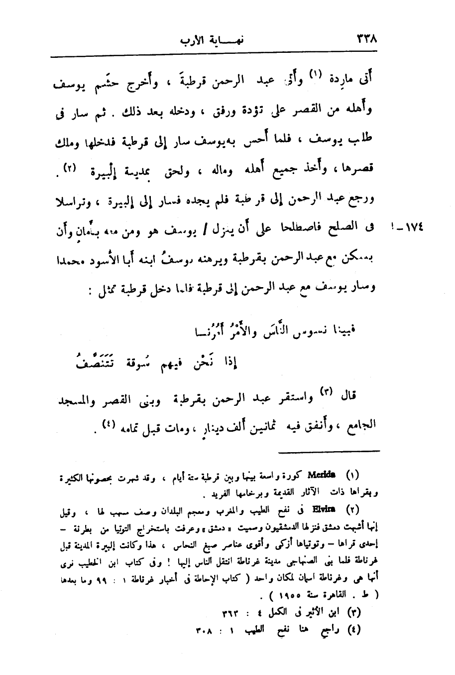 أتى ماردة «1» وأتى عبد الرحمن قرطبة، وأخرج حشم يوسف وأهله من القصر على تؤدة ورفق، ودخله بعد ذلك. ثم سار فى طلب يوسف، فلما أحس به يوسف سار إلى قرطبة فدخلها وملك قصرها، وأخذ جميع أهله وماله، ولحق بمدينة إلبيرة «2» .