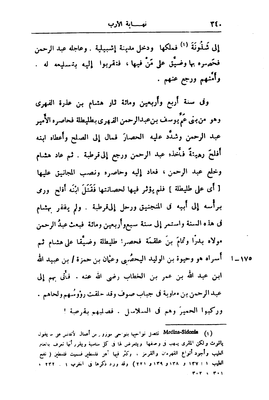 وفى سنة أربع وأربعين ومائة ثار هشام بن عذرة الفهرى وهو من بنى عمّ يوسف بن عبد الرحمن الفهرى بطليطلة فحاصره الأمير عبد الرحمن وشدّد عليه الحصار فمال إلى الصلح وأعطاه ابنه أفلح رهينة فأخذه عبد الرحمن ورجع إلى قرطبة. ثم عاد هشام وخلع عبد الرحمن، فعاد إليه وحاصره ونصب المجانيق عليها [أى على طليطلة] فلم يؤثر فيها لحصانتها فقتل ابنه أفلح ورمى برأسه إلى أبيه فى المنجنيق ورحل إلى قرطبة. ولم يظفر بهشام فى هذه السنة واستمر إلى سنة سبع وأربعين ومائة فبعث عبد الرحمن مولاه بدرا وتمام بن علقمة فحصرا طليطلة وضيّقا على هشام ثم أسراه هو وحيوة بن الوليد اليحصبى وعثمان بن حمزة/ بن عبيد الله ابن عبد الله بن عمر بن الخطاب رضى الله عنه. فأتى بهم إلى عبد الرحمن بن معاوية فى جباب صوف وقد حلقت رؤوسهم ولحاهم.