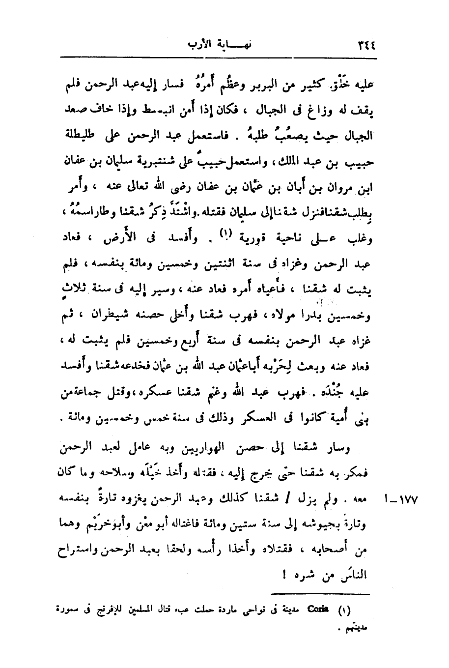 عليه خلق كثير من البربر وعظم أمره فسار إليه عبد الرحمن فلم يقف له وزاغ فى الجبال، فكان إذا أمن انبسط وإذا خاف صعد الجبال حيث يصعب طلبه. فاستعمل عبد الرحمن على طليطلة حبيب بن عبد الملك، واستعمل حبيب على شنتبرية سليمان بن عفان ابن مروان بن أبان بن عثمان بن عفان رضى الله تعالى عنه، وأمر بطلب شقنا فنزل شقنا إلى سليمان فقتله. واشتدّ ذكر شقنا وطار اسمه، وغلب على ناحية قورية «1» ، وأفسد فى الأرض، فعاد عبد الرحمن وغزاه فى سنة اثنتين وخمسين ومائة بنفسه، فلم يثبت له شقنا، فأعياه أمره فعاد عنه، وسير إليه فى سنة ثلاث وخمسين بدرا مولاه، فهرب شقنا وأخلى حصنه شيطران، ثم غزاه عبد الرحمن بنفسه فى سنة أربع وخمسين فلم يثبت له، فعاد عنه وبعث لحربه أبا عثمان عبد الله بن عثمان فخدعه شقنا وأفسد عليه جنده. فهرب عبد الله وغنم شقنا عسكره، وقتل جماعة من بنى أمية كانوا فى العسكر وذلك فى سنة خمس وخمسين ومائة.