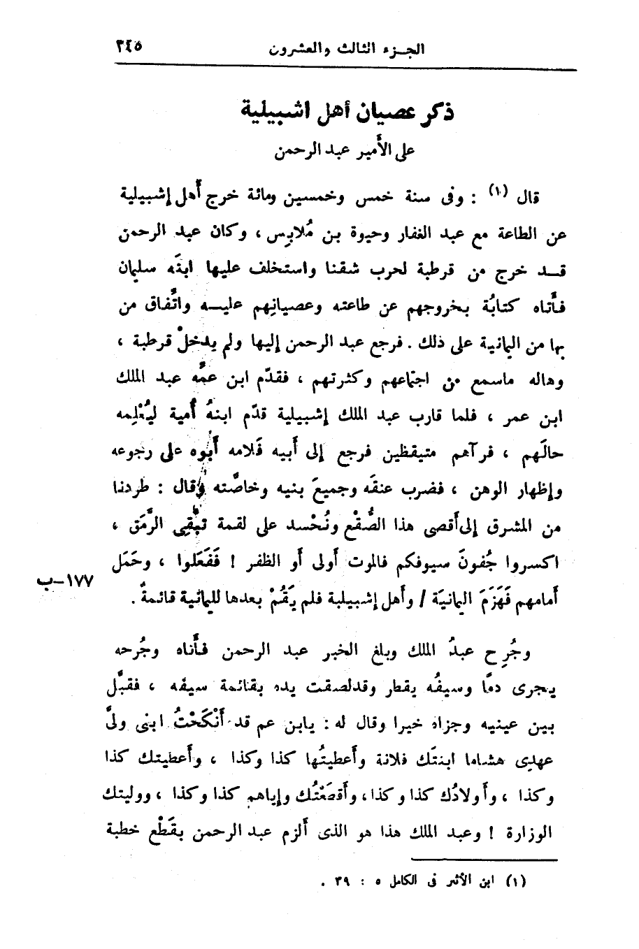 قال «1» : وفى سنة خمس وخمسين ومائة خرج أهل إشبيلية عن الطاعة مع عبد الغفار وحيوة بن ملابس، وكان عبد الرحمن قد خرج من قرطبة لحرب شقنا واستخلف عليها ابنه سليمان فأتاه كتابة بخروجهم عن طاعته وعصيانهم عليه واتّفاق من بها من اليمانية على ذلك. فرجع عبد الرحمن إليها ولم يدخل قرطبة، وهاله ما سمع من اجتماعهم وكثرتهم، فقدّم ابنه عمّه عبد الملك ابن عمر، فلما قارب عبد الملك إشبيلية قدّم ابنه أمية ليعلمه حالهم، فرآهم متيقظين فرجع إلى أبيه فلامه أبوه على رجوعه وإظهار الوهن، فضرب عنقه وجميع بنيه وخاصّته وقال: طردنا من المشرق إلى أقصى هذا الصّقع ونحسد على لقمة تبقى الرّمق، اكسروا جفون سيوفكم فالموت أولى أو الظفر! ففعلوا، وحمل أمامهم فهزم اليمانية/ وأهل إشبيلبة فلم يقم بعدها لليمانية قائمة.
