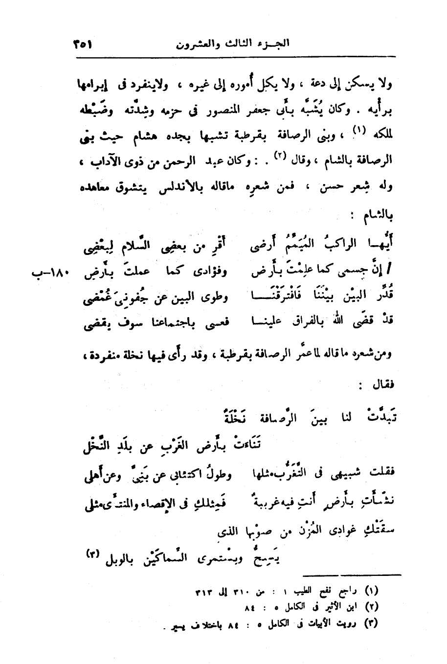 ولا يسكن إلى دعة، ولا يكل أموره إلى غيره، ولا ينفرد فى إبرامها برأيه. وكان يشبّه بأبى جعفر المنصور فى حزمه وشدّته وضبطه لملكه «1» ، وبنى الرصافة بقرطبة تشبها بجده هشام حيث بنى الرصافة بالشام، وقال «2» .: وكان عبد الرحمن من ذوى الآداب، وله شعر حسن، فمن شعره ما قاله بالأندلس يتشوق معاهده بالشام: