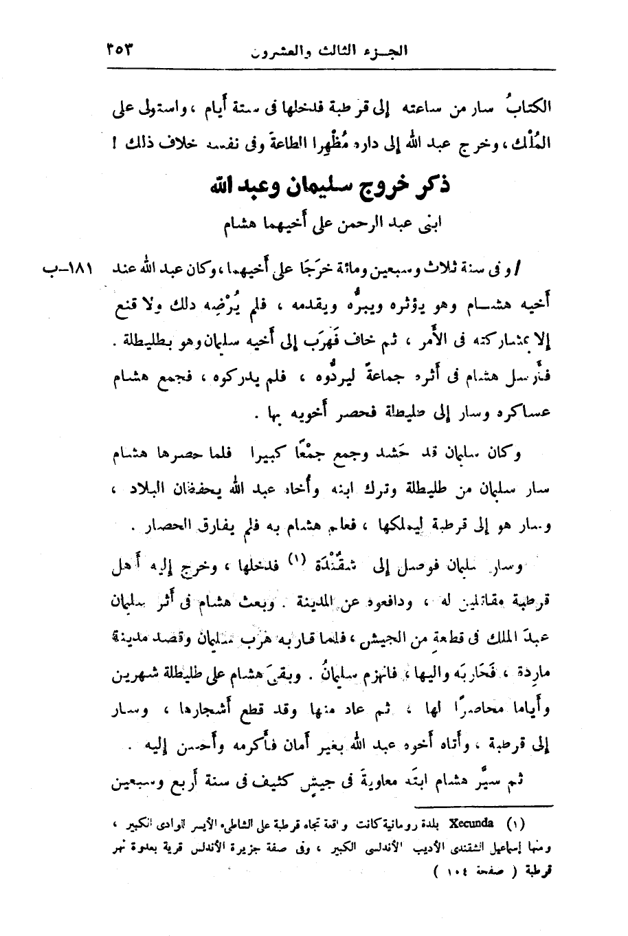 / وفى سنة ثلاث وسبعين ومائة خرجا على أخيهما، وكان عبد الله عند أخيه هشام وهو يؤثره ويبرّه ويقدمه، فلم يرضه ذلك ولا قنع إلا بمشاركته فى الأمر، ثم خاف فهرب إلى أخيه سليمان وهو بطليطلة.