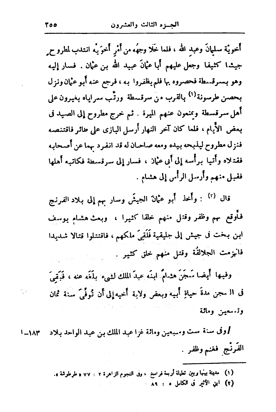 وفيها أيضا سجن هشام ابنه عبد الملك لشىء بلغه عنه، فبقى فى السجن مدة حياة أبيه وبعض ولاية أخيه إلى أن توفّى سنة ثمان وتسعين ومائة/ وفى سنة ست وسبعين ومائة غزا عبد الملك بن عبد الواحد بلاد الفرنج فغنم وظفر.