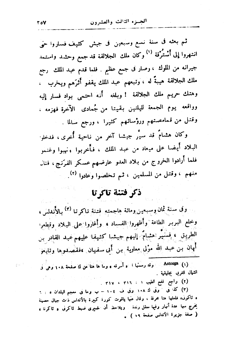 وفى سنة ثمان وسبعين ومائة هاجمته فتنة تاكرتا «3» بالأندلس، وخلع البربر الطاعة وأظهروا الفساد، وأغاروا على البلاد وقطعوا الطريق، فسيّر هشام إليهم جيشا كثيفا عليهم عبد القادر بن أبان بن عبد الله مولى معاوية بن أبى سفيان، فقصدوها وتابعو