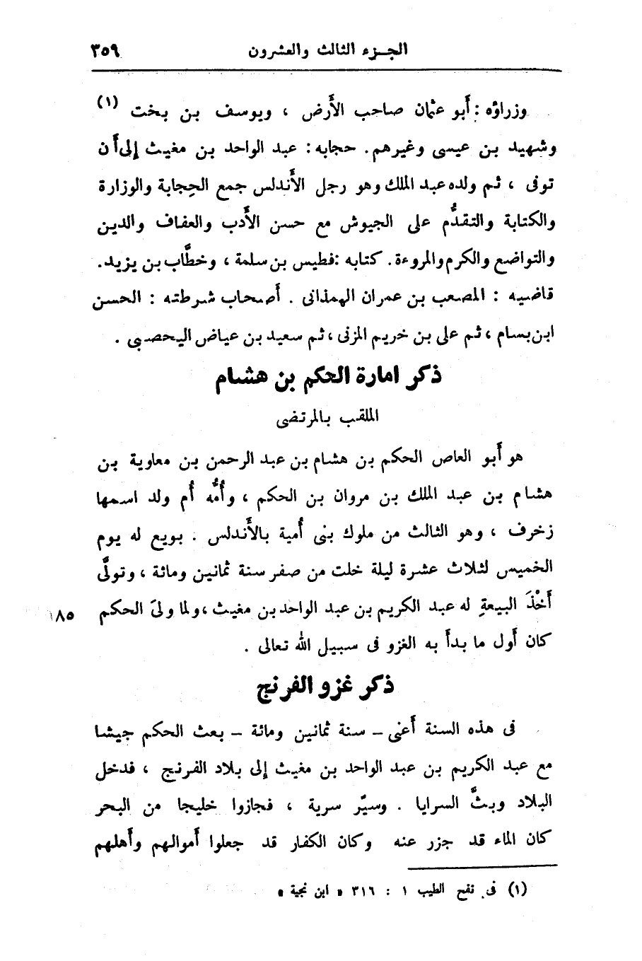 فى هذه السنة أعنى- سنة ثمانين ومائة- بعث الحكم جيشا مع عبد الكريم بن عبد الواحد بن مغيث إلى بلاد الفرنج، فدخل البلاد وبثّ السرايا. وسيّر سرية، فجازوا خليجا من البحر كان الماء قد جزر عنه وكان الكفار قد جعلوا أموالهم وأهلهم