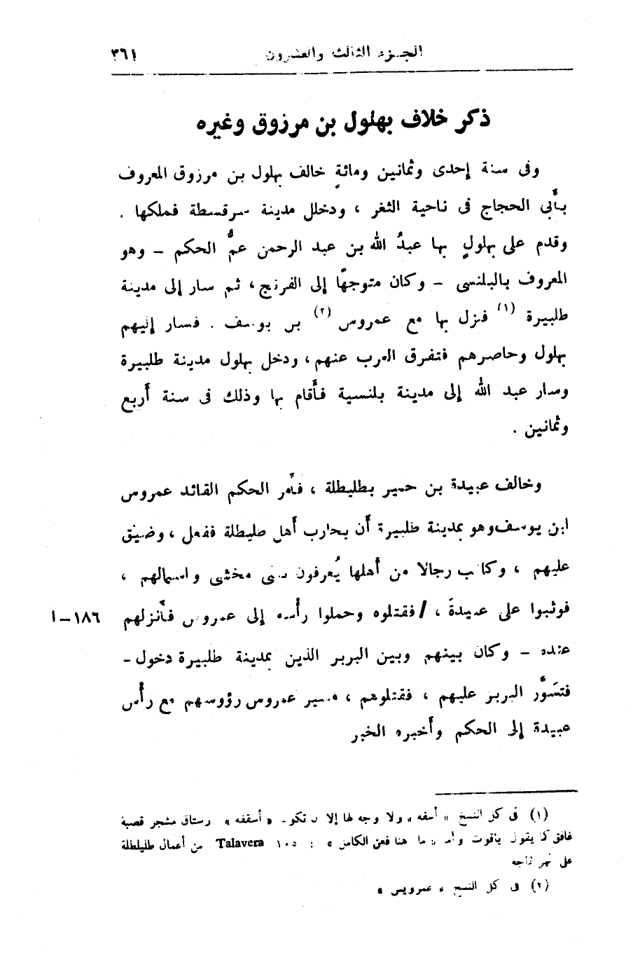 وقدم على بهلول بها عبد الله بن عبد الرحمن عمّ الحكم- وهو المعروف بالبلنسى- وكان متوجّها إلى الفرنج، ثم سار إلى مدينة طلبيرة «1» فنزل بها مع عمروس «2» بن يوسف. فسار إليهم بهلول وحاصرهم فتفرق العرب عنهم، ودخل بهلول مدينة طلبيرة وسار عبد الله إلى مدينة بلنسية فأقام بها وذلك فى سنة أربع وثمانين.