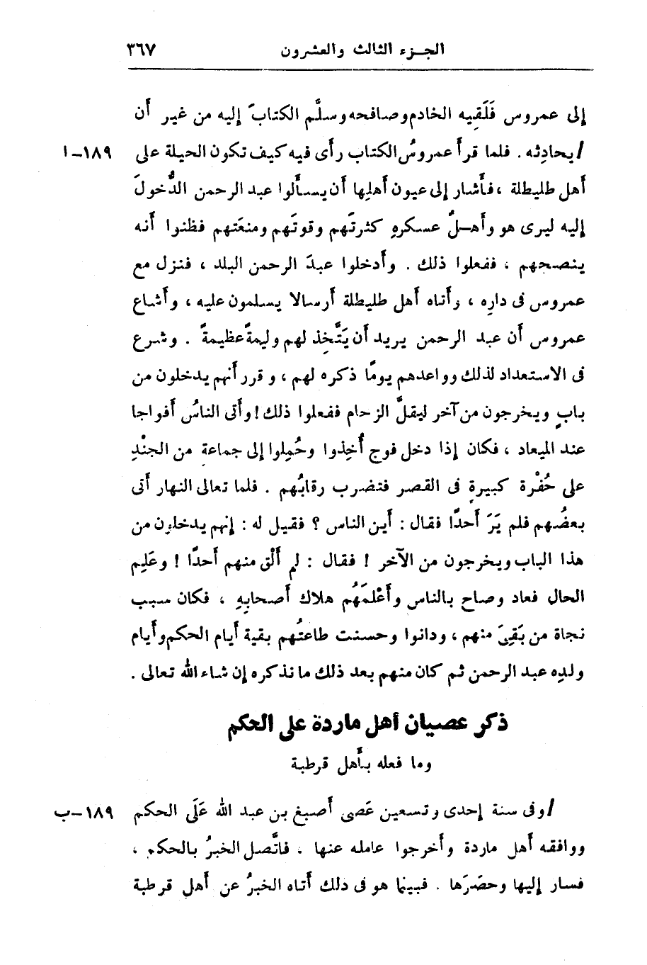 إلى عمروس فلقيه الخادم وصافحه وسلّم الكتاب إليه من غير أن/ يحادثه. فلما قرأ عمروس الكتاب رأى فيه كيف تكون الحيلة على أهل طليطلة، فأشار إلى عيون أهلها أن يسألوا عبد الرحمن الدّخول إليه ليرى هو وأهل عسكره كثرتهم وقوتهم ومنعتهم فظنوا أنه ينصحهم، ففعلوا ذلك. وأدخلوا عبد الرحمن البلد، فنزل مع عمروس فى داره، وأتاه أهل طليطلة أرسالا يسلمون عليه، وأشاع عمروس أن عبد الرحمن يريد أن يتّخذ لهم وليمة عظيمة. وشرع فى الاستعداد لذلك وواعدهم يوما ذكره لهم، وقرر أنهم يدخلون من باب ويخرجون من آخر ليقلّ الزحام ففعلوا ذلك! وأتى الناس أفواجا عند الميعاد، فكان إذا دخل فوج أخذوا وحملوا إلى جماعة من الجند على حفرة كبيرة فى القصر فتضرب رقابهم. فلما تعالى النهار أتى بعضهم فلم ير أحدا فقال: أين الناس؟ فقيل له: إنهم يدخلون من هذا الباب ويخرجون من الآخر! فقال: لم ألق منهم أحدا! وعلم الحال فعاد وصاح بالناس وأعلمهم هلاك أصحابه، فكان سبب نجاة من بقى منهم، ودانوا وحسنت طاعتهم بقية أيام الحكم وأيام ولده عبد الرحمن ثم كان منهم بعد ذلك ما نذكره إن شاء الله تعالى.
