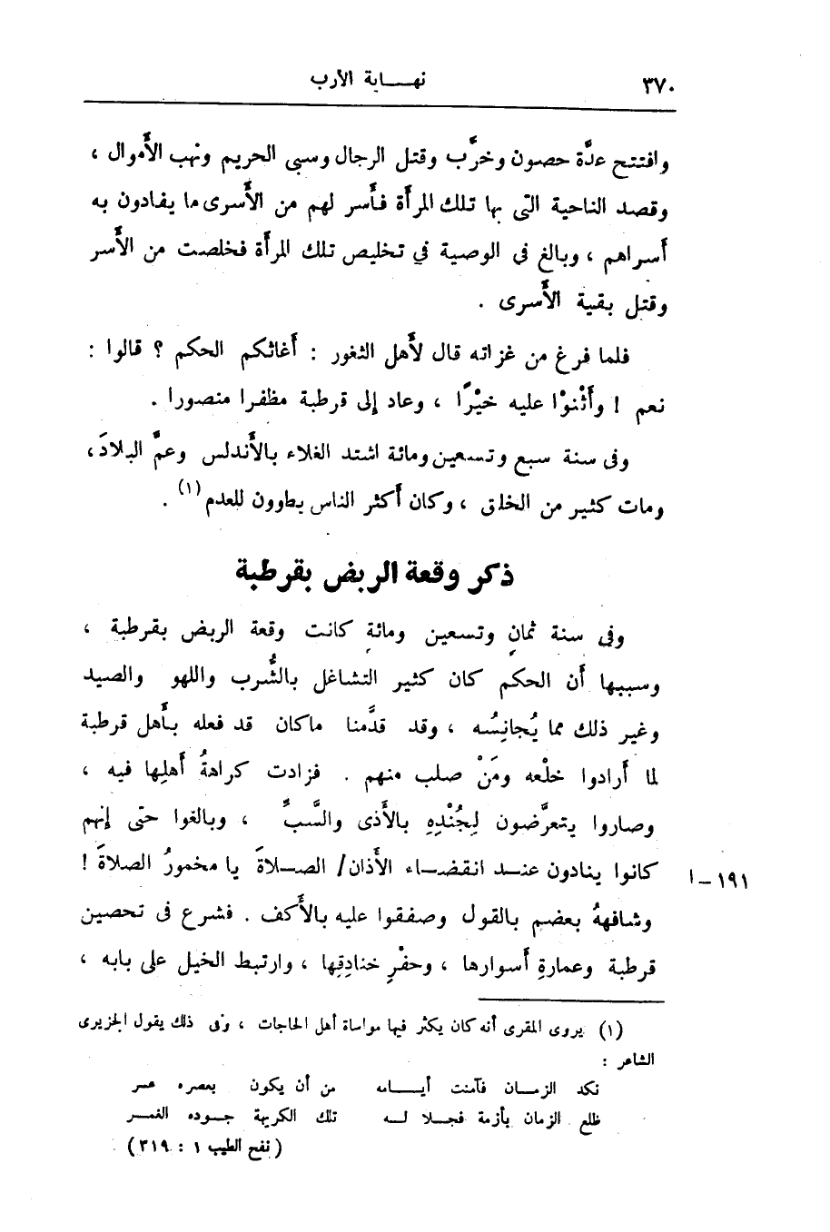 وفى سنة ثمان وتسعين ومائة كانت وقعة الربض بقرطبة، وسببها أن الحكم كان كثير التشاغل بالشّرب واللهو والصيد وغير ذلك مما يجانسه، وقد قدّمنا ما كان قد فعله بأهل قرطبة لما أرادوا خلعه ومن صلب منهم. فزادت كراهة أهلها فيه، وصاروا يتعرّضون لجنده بالأذى والسّبّ، وبالغوا حتى إنهم كانوا ينادون عند انقضاء الأذان/ الصلاة يا مخمور الصلاة! وشافهه بعضهم بالقول وصفقوا عليه بالأكف. فشرع فى تحصين قرطبة وعمارة أسوارها، وحفر خنادقها، وارتبط الخيل على بابه،