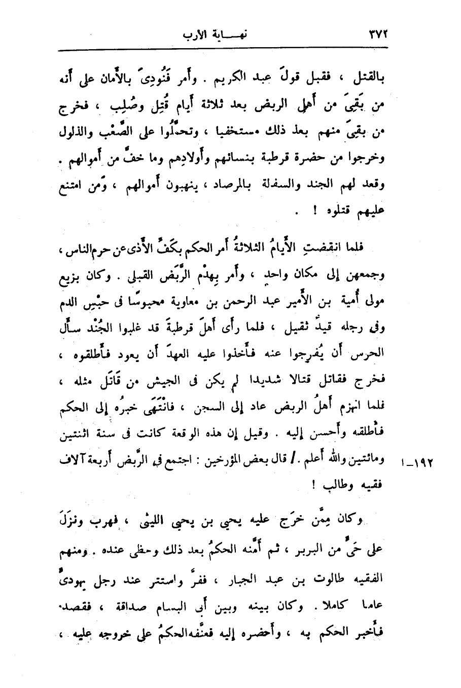 فلما انقضت الأيام الثلاثة أمر الحكم بكفّ الأذى عن حرم الناس، وجمعهن إلى مكان واحد، وأمر بهدم الرّبض القبلى. وكان بزيع مولى أمية بن الأمير عبد الرحمن بن معاوية محبوسا فى حبس الدم وفى رجله قيد ثقيل، فلما رأى أهل قرطبة قد غلبوا الجند سأل الحرس أن يفرجوا عنه فأخذوا عليه العهد أن يعود فأطلقوه، فخرج فقاتل قتالا شديدا لم يكن فى الجيش من قاتل مثله، فلما انهزم أهل الربض عاد إلى السجن، فانتهى خبره إلى الحكم فأطلقه وأحسن إليه. وقيل إن هذه الوقعة كانت فى سنة اثنتين ومائتين والله أعلم./ قال بعض المؤرخين: اجتمع فى الرّبض أربعة آلاف فقيه وطالب! وكان ممّن خرج عليه يحيى بن يحيى الليثى، فهرب ونزل على حىّ من البربر، ثم أمّنه الحكم بعد ذلك وحظى عنده. ومنهم الفقيه طالوت بن عبد الجبار، ففرّ واستتر عند رجل يهودىّ عاما كاملا. وكان بينه وبين أبى البسام صداقة، فقصد فأخبر الحكم به، وأحضره إليه فعنّفه الحكم على خروجه عليه،
