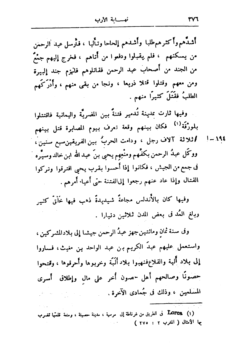 وفيها ثارت بمدينة تدمير فتنة بين المضريّة واليمانية فاقتتلوا بلورقة «1» فكان بينهم وقعة تعرف بيوم المصابرة قتل بينهم/ ثلاثة آلاف رجل، ودامت الحرب بين الفريقين سبع سنين، ووكل عبد الرحمن بكفّهم ومنعهم يحيى بن عبد الله ابن خالد وسيّره فى جمع من الجيش، فكانوا إذا أحسوا بقرب يحيى افترقوا وتركوا القتال وإذا عاد عنهم رجعوا إلى الفتنة حتى أعياه أمرهم.