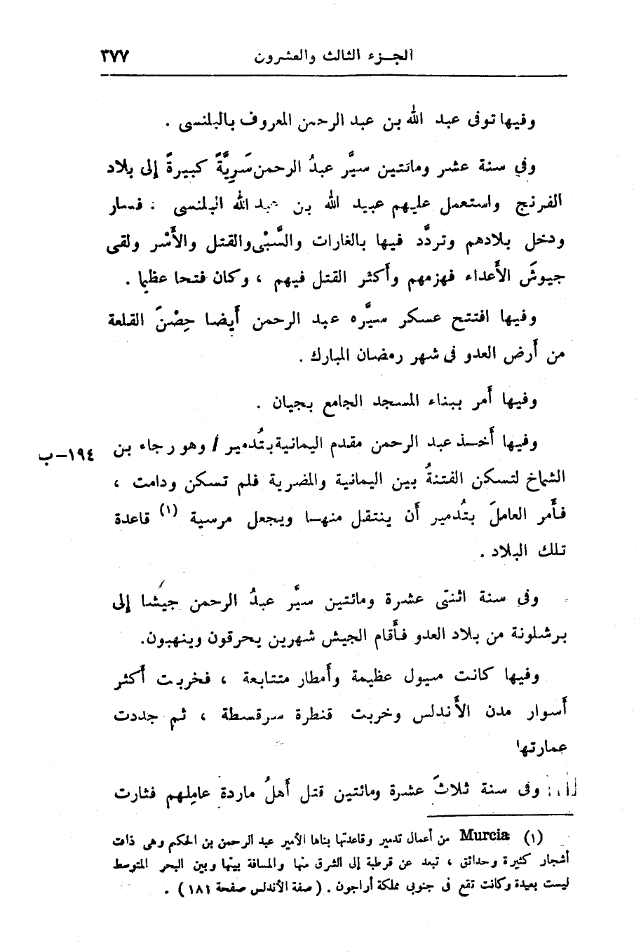 وفيها أخذ عبد الرحمن مقدم اليمانية بتدمير/ وهو رجاء بن الشماخ لتسكن الفتنة بين اليمانية والمضرية فلم تسكن ودامت، فأمر العامل بتدمير أن ينتقل منها ويجعل مرسية «1» قاعدة تلك البلاد.