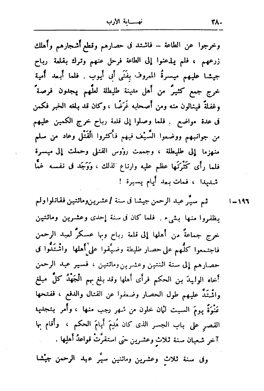 وخرجوا عن الطاعة- فاشتد فى حصارهم وقطع أشجارهم وأهلك زرعهم، فلم يذعنوا إلى الطاعة فرحل عنهم وترك بقلعة رباح جيشا عليهم ميسرة المعروف بفتى أبى أيوب. فلما أبعد أمية خرج جمع كثير من أهل مدينة طليطلة لعلّهم يجدون فرصة وغفلة فينالون منه ومن أصحابه غرضا، وكان قد بلغه الخبر فكمن فى عدة مواضع. فلما وصلوا إلى قلعة رباح خرج الكمين عليهم من جوانبهم ووضعوا السّيف فيهم فأكثروا القتل وعاد من سلم منهزما إلى طليطلة، وجمعت رؤوس القتلى وحملت إلى ميسرة فلما رأى كثرتها عظم عليه وارتاع لذلك، ووجد فى نفسه غمّا شديدا، فمات بعد أيام يسيرة! ثم سيّر عبد الرحمن جيشا فى سنة/ عشرين ومائتين فقاتلوا ولم يظفروا منها بشىء. فلما كان فى سنة إحدى وعشرين ومائتين خرج جماعة من أهلها إلى قلعة رباح وبها عسكر لعبد الرحمن فاجتمعوا كلّهم على حصار طليطة وضيّقوا على أهلها واشتدّوا فى حصارهم إلى سنة اثنتين وعشرين ومائتين، فسير عبد الرحمن أخاه الوليد بن الحكم فرأى أهلها وقد بلغ بهم الجهد كلّ مبلغ واشتدّ عليهم طول الحصار وضعفوا عن القتال والدفع، ففتحها عنوة يوم السبت لثمان خلون من شهر رجب منها، وأمر بتجديد القصر على باب الجسر الذى كان هدم أيام الحكم، وأقام بها آخر شعبان سنة ثلاث وعشرين حتى استقرّت قواعد أهلها.