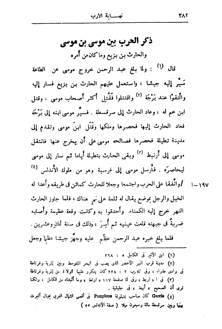 قال «1» : ولما بلغ عبد الرحمن خروج موسى عن الطاعة سيّر إليه جيشا، واستعمل عليهم الحارث بن بزيع فسار إليه والتقوا عند برجة «2» واقتتلوا فقتل أكثر أصحاب موسى، وقتل ابن عم له، وعاد الحارث إلى سرقسطة. فسيّر موسى ابنه إلى برحة فعاد الحارث إليها فحصرها وملكها وقتل ابن موسى وتقدم إلى مدينة تطيلة فحصرها فصالحه موسى على أن يخرج عنها فانتقل موسى إلى أرنيط «3» وبقى الحارث بتطيلة أياما ثم سار إلى موسى ليحاصره. فأرسل موسى إلى غرسية وهو من ملوك الأندلس «4» /واتّفقا على الحرب واجتمعا وجعلا للحارث كمائن فى طريقه وأعدا له الخيل والرجل بموضع يقال له ثلمة على نهر هناك، فلما جاوز الحارث النهر خرج إليه الكمناء وأحدقوا به وكانت وقعة عظيمة وأصابه ضربة فى جبهته قلعت عينيه ثم أسر، وذلك فى سنة ثمان وعشرين.