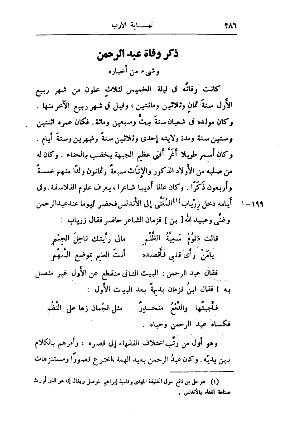 وكان أسمر طويلا أغرّ أقنى عظيم الجبهة يخضب بالحناء. وكان له من صلبه من الأولاد الذكور والإناث سبعة وثمانون ولدا منهم خمسة وأربعون ذكرا. وكان عالما أديبا شاعرا، يعرف علوم الفلاسفة. وفى أيامه دخل زرياب «1» المغنّى إلى الأندلس فحضر/ يوما عند عبد الرحمن وغنّى وعبيد الله [بن] قزمان الشاعر حاضر فقال زرياب: