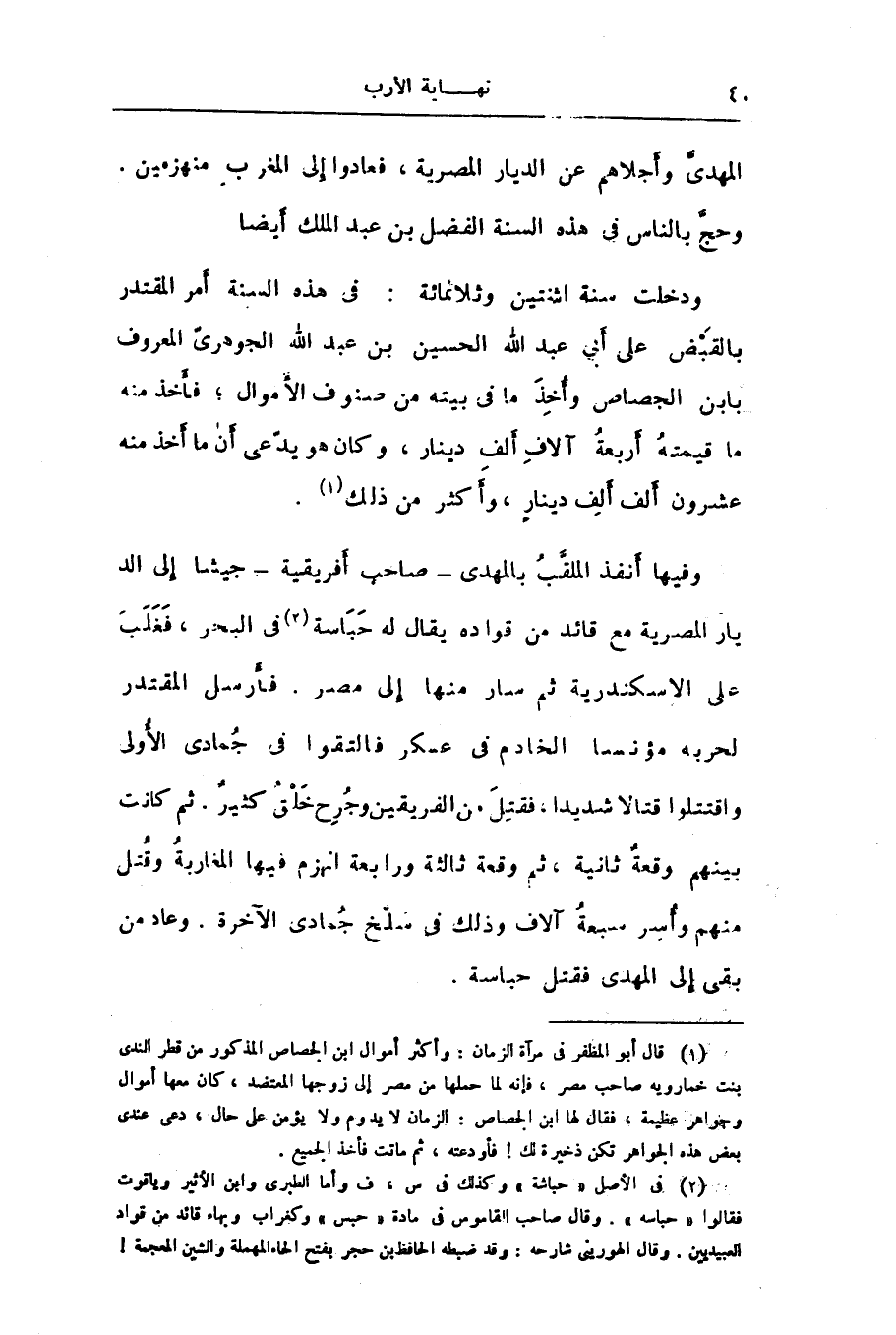 وفيها أنفذ الملقّب بالمهدى- صاحب أفريقية- جيشا إلى الد يار المصرية مع قائد من قواده يقال له حباسة «2» فى البحر، فغلب على الاسكندرية ثم سار منها إلى مصر. فأرسل المقتدر لحربه مؤنسا الخادم فى عسكر فالتقوا فى جمادى الأولى واقتتلوا قتالا شديدا، فقتل من الفريقين وجرح خلق كثير. ثم كانت بينهم وقعة ثانية، ثم وقعة ثالثة ورابعة انهزم فيها المغاربة وقتل منهم وأسر سبعة آلاف وذلك فى سلّخ جمادى الآخرة. وعاد من بقى إلى المهدى فقتل حباسة.