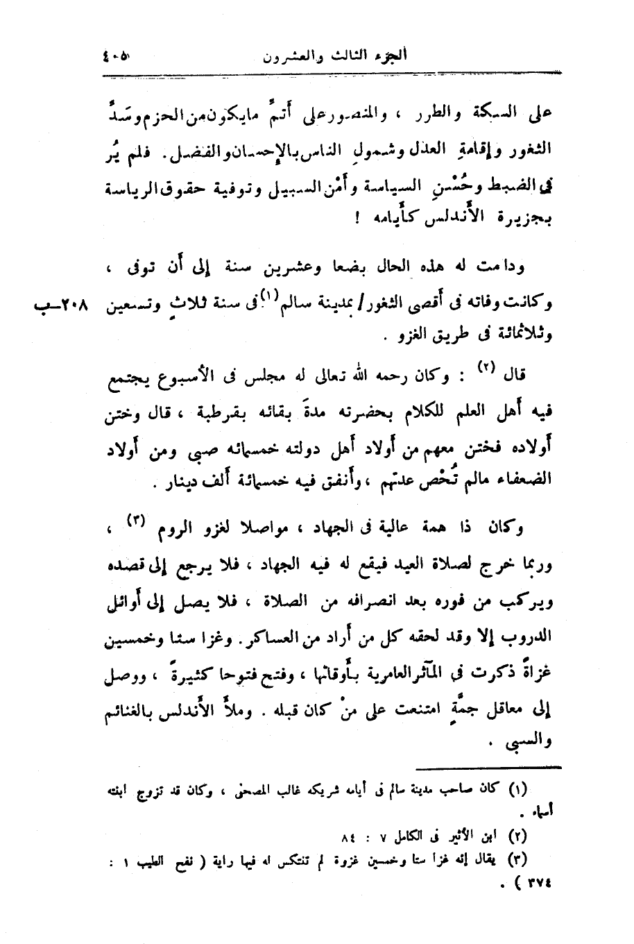 وكان ذا همة عالية فى الجهاد، مواصلا لغزو الروم «3» ، وربما خرج لصلاة العيد فيقع له فيه الجهاد، فلا يرجع إلى قصده ويركب من فوره بعد انصرافه من الصلاة، فلا يصل إلى أوائل الدروب إلا وقد لحقه كل من أراد من العساكر. وغزا ستا وخمسين غزاة ذكرت فى المآثر العامرية بأوقاتها، وفتح فتوحا كثيرة، ووصل إلى معاقل جمّة امتنعت على من كان قبله. وملأ الأندلس بالغنائم والسبى.