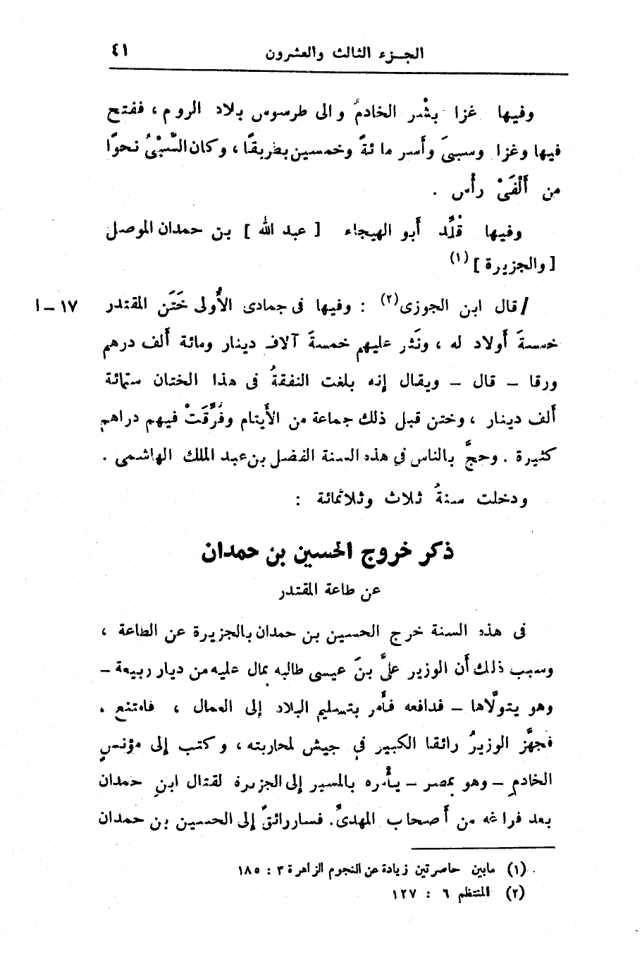 عن طاعة المقتدر فى هذه السنة خرج الحسين بن حمدان بالجزيرة عن الطاعة، وسبب ذلك أن الوزير علىّ بن عيسى طالبه بمال عليه من ديار ربيعة- وهو يتولّاها- فدافعه فأمر بتسليم البلاد إلى العمال، فامتنع، فجهّز الوزير رائقا الكبير فى جيش لمحاربته، وكتب إلى مؤنس الخادم- وهو بمصر- يأمره بالمسير إلى الجزيرة لقتال ابن حمدان بعد فراغه من أصحاب المهدىّ. فسار رائق إلى الحسين بن حمدان