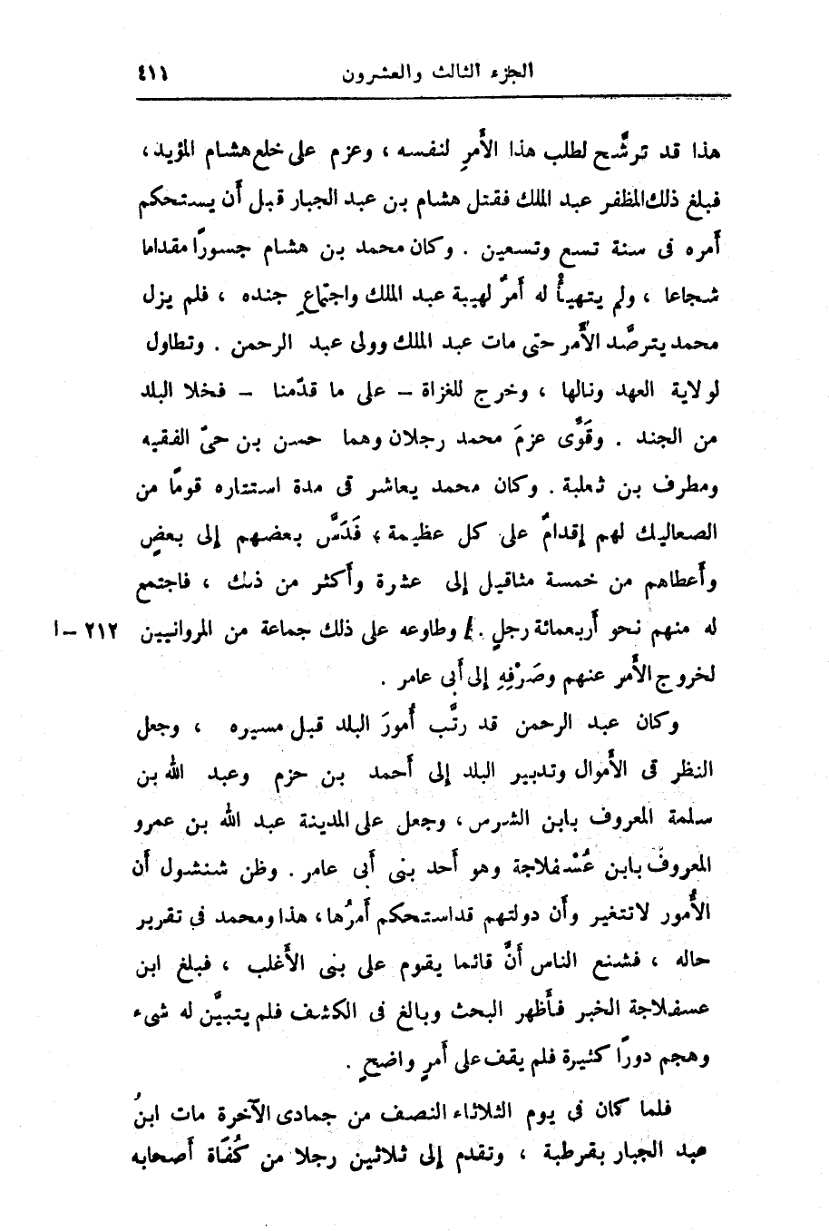 هذا قد ترشّح لطلب هذا الأمر لنفسه، وعزم على خلع هشام المؤيد، فبلغ ذلك المظفر عبد الملك فقتل هشام بن عبد الجبار قبل أن يستحكم أمره فى سنة تسع وتسعين. وكان محمد بن هشام جسورا مقداما شجاعا، ولم يتهيأ له أمر لهيبة عبد الملك واجتماع جنده، فلم يزل محمد يترصّد الأمر حتى مات عبد الملك وولى عبد الرحمن. وتطاول لولاية العهد ونالها، وخرج للغزاة- على ما قدّمنا- فخلا البلد من الجند. وقوّى عزم محمد رجلان وهما حسن بن حىّ الفقيه ومطرف بن ثعلبة. وكان محمد يعاشر فى مدة استتاره قوما من الصعاليك لهم إقدام على كل عظيمة، فدسّ بعضهم إلى بعض وأعطاهم من خمسة مثاقيل إلى عشرة وأكثر من ذلك، فاجتمع له منهم نحو أربعمائة رجل./ وطاوعه على ذلك جماعة من المروانيين لخروج الأمر عنهم وصرفه إلى أبى عامر.