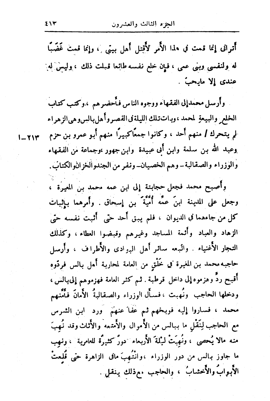 وأرسل محمد إلى الفقهاء ووجوه الناس فأحضرهم، وكتب كتاب الخلع والبيعة لمحمد، وبات تلك الليلة فى القصر وأهل بالس وهى الزهراء لم يتحرك/ منهم أحد، وكانوا جمعا كبيرا منهم أبو عمرو بن حزم وعبد الله بن سلمة وابن أبى عبيدة وابن جهور، وجماعة من الفقهاء والوزراء والصقالبة- وهم الخصيان- ونفر من الجند والخزان والكتاب.