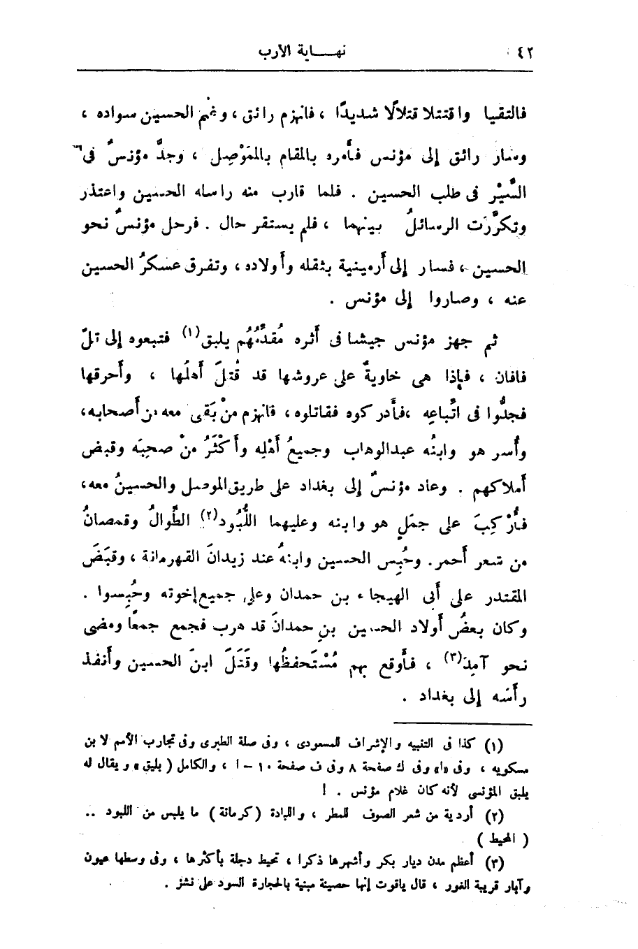 ثم جهز مؤنس جيشا فى أثره مقدّمهم يلبق «1» فتبعوه إلى تلّ فافان، فإذا هى خاوية على عروشها قد قتل أهلها، وأحرقها فجدّوا فى اتّباعه، فأدركوه فقاتلوه، فانهزم من بقى معه من أصحابه، وأسر هو وابنه عبد الوهاب وجميع أهله وأكثر من صحبه وقبض أملاكهم. وعاد مؤنس إلى بغداد على طريق الموصل والحسين معه، فأركب على جمل هو وابنه وعليهما اللّبود «2» الطّوال وقمصان من شعر أحمر. وحبس الحسين وابنه عند زيدان القهرمانة، وقبض المقتدر على أبى الهيجاء بن حمدان وعلى جميع إخوته وحبسوا.