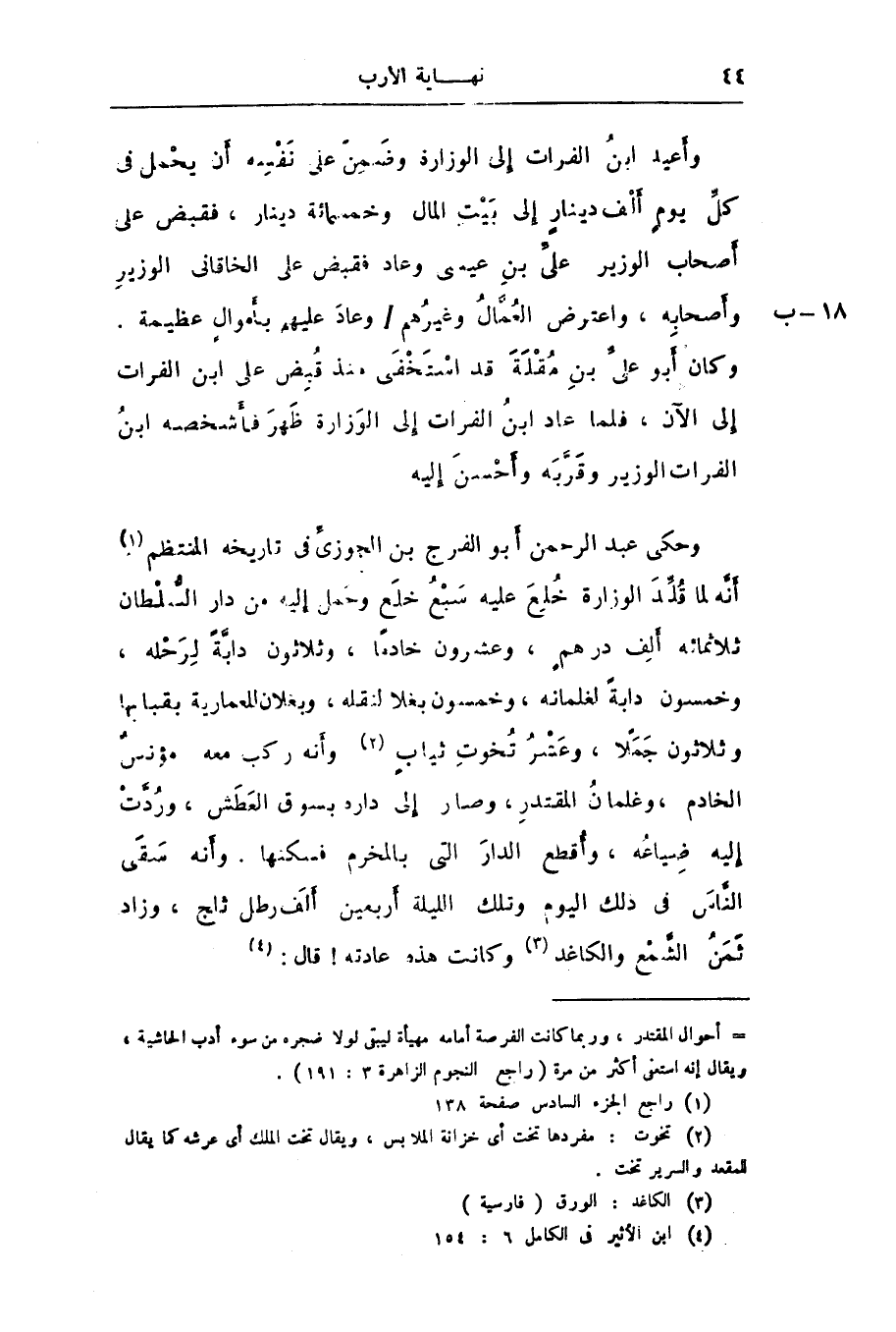 وأعيد ابن الفرات إلى الوزارة وضمن على نفسه أن يحمل فى كلّ يوم ألف دينار إلى بيت المال وخمسمائة دينار، فقبض على أصحاب الوزير علىّ بن عيسى وعاد فقبض على الخاقانى الوزير وأصحابه، واعترض العمّال وغيرهم/ وعاد عليهم بأموال عظيمة.
