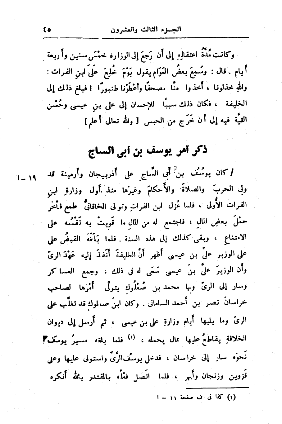 / كان يوسف بن أبى السّاج على أذربيجان وأرمينة قد ولى الحرب والصلاة والأحكام وغيرها منذ أول وزارة ابن الفرات الأولى، فلما عزل ابن الفرات وتولى الخاقانىّ طمع فأخر حمل بعض المال، فاجتمع له من المال ما قويت به نفسه على الامتناع، وبقى كذلك إلى هذه السنة. فلما بلغه القبض على على الوزير علىّ بن عيسى أظهر أنّ الخليفة أنفذ إليه عهد الرىّ وأن الوزير علىّ بن عيسى سعى له فى ذلك، وجمع العساكر وسار إلى الرىّ وبها محمد بن صعلوك يتولّى أمرها لصاحب خراسان نصر بن أحمد السامانى. وكان ابن صعلوك قد تغلّب على الرىّ وما يليها أيام وزارة على بن عيسى، ثم أرسل إلى ديوان الخلافة يقاطع عليها بمال يحمله، «1» فلما بلغه مسير يوسف نحوه سار إلى خراسان، فدخل يوسف الرّىّ واستولى عليها وعلى قزوين وزنجان وأبهر، فلما اتصل فعله بالمقتدر بالله أنكره