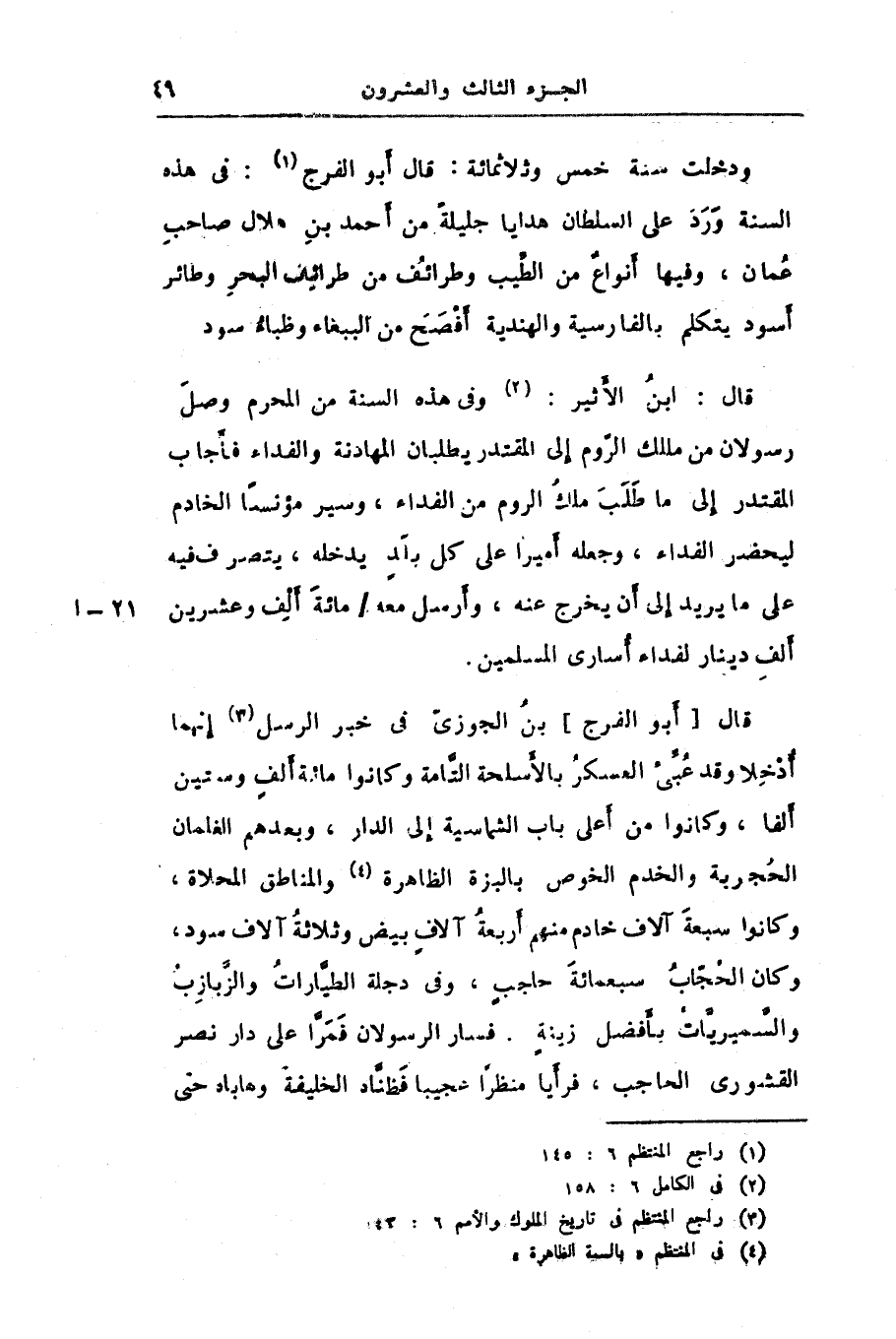 ودخلت سنة خمس وثلاثمائة: قال أبو الفرج «1» : فى هذه السنة ورد على السلطان هدايا جليلة من أحمد بن هلال صاحب عمان، وفيها أنواع من الطّيب وطرائف من طرائف البحر وطائر أسود يتكلم بالفارسية والهندية أفصح من الببغاء وظباء سود قال: ابن الأثير: «2» وفى هذه السنة من المحرم وصل رسولان من مالك الرّوم إلى المقتدر يطلبان المهادنة والفداء فأجاب المقتدر إلى ما طلب ملك الروم من الفداء، وسير مؤنسا الخادم ليحضر الفداء، وجعله أميرا على كل بلد يدخله، يتصرف فيه على ما يريد إلى أن يخرج عنه، وأرسل معه/ مائة ألف وعشرين ألف دينار لفداء أسارى المسلمين.
