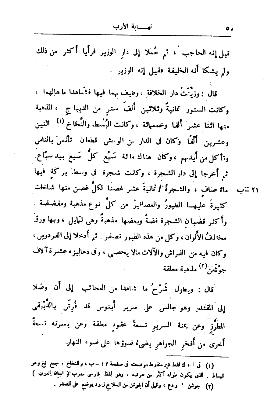 وأكثر قضبان الشجرة فضة وبعضها مذهبة وهى تتمايل، وبها ورق مختلف الألوان، وكل من هذه الطيور تصفر. ثم أدخلا إلى الفردوس، وكان فيه من الفراش والآلات ما لا يحصى، وفى دهاليزه عشرة آلاف جوشن «2» مذهبة معلقة قال: ويطول شرح ما شاهدا من العجائب إلى أن وصلا إلى المقتدر وهو جالس على سرير أبنوس قد فرش بالدّيبقى المطرّز وعن يمنة السرير تسعة عقود معلقة وعن يسرته تسعة أخرى من أفخر الجواهر يضىء ضوؤها على ضوء النهار