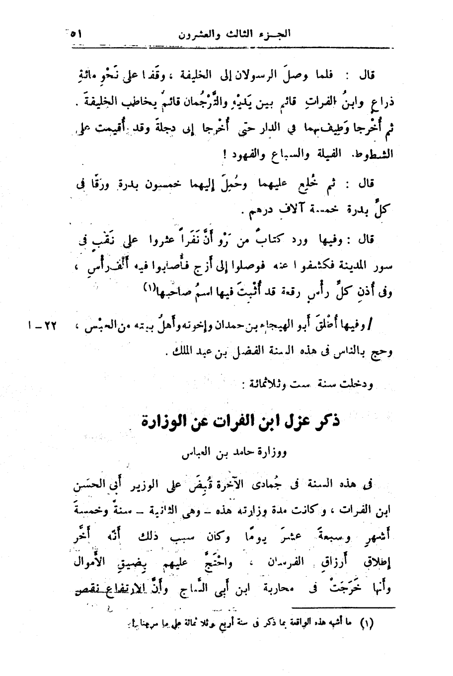 ووزارة حامد بن العباس فى هذه السنة فى جمادى الآخرة قبض على الوزير أبى الحسن ابن الفرات، وكانت مدة وزارته هذه- وهى الثانية- سنة وخمسة أشهر وسبعة عشر يوما وكان سبب ذلك أنّه أخّر إطلاق أرزاق الفرسان، واحتجّ عليهم بضيق الأموال وأنها خرجت فى محاربة ابن أبى السّاج وأنّ الارتفاع نقص