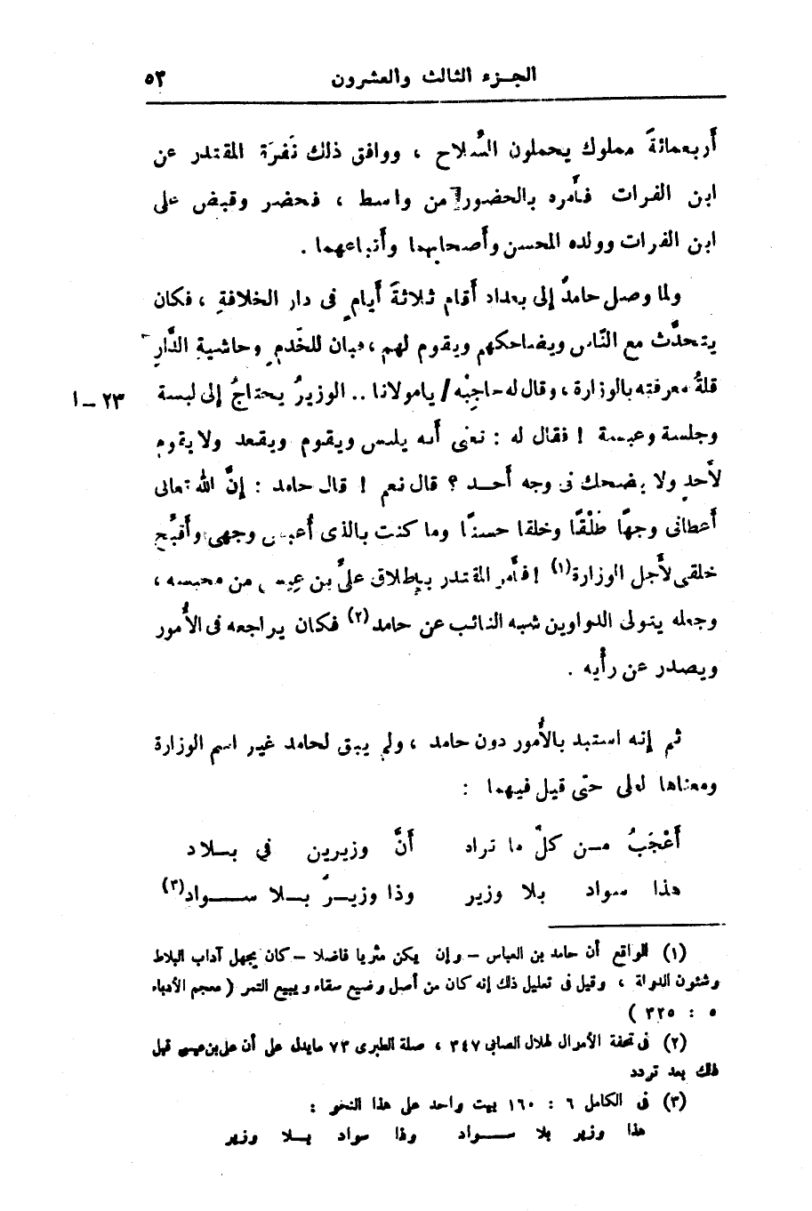 ولما وصل حامد إلى بغداد أقام ثلاثة أيام فى دار الخلافة، فكان يتحدّث مع النّاس ويضاحكهم ويقوم لهم، فبان للخدم وحاشية الدّار قلة معرفته بالوزارة، وقال له حاجبه/ يا مولانا.. الوزير يحتاج إلى لبسة وجلسة وعبسة! فقال له: تعنى أنه يلبس ويقوم ويقعد ولا يقوم لأحد ولا يضحك فى وجه أحد؟ قال نعم! قال حامد: إنّ الله تعالى أعطانى وجها طلقا وخلقا حسنا وما كنت بالذى أعبس وجهى وأقبّح خلقى لأجل الوزارة «1» ! فأمر المقتدر بإطلاق علىّ بن عيسى من محبسه، وجعله يتولى الدواوين شبه النائب عن حامد «2» فكان يراجعه فى الأمور ويصدر عن رأيه.
