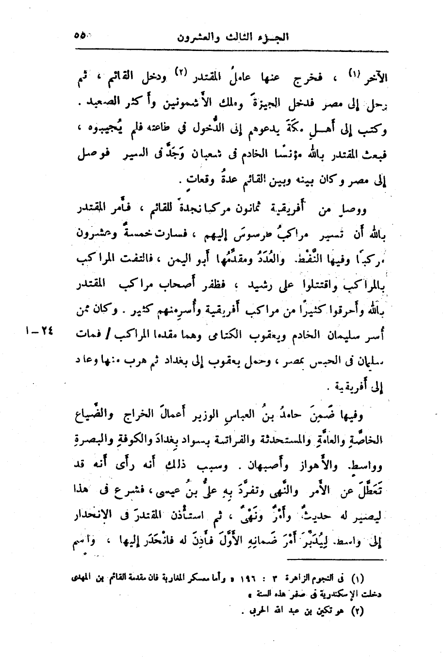 ووصل من أفريقية ثمانون مركبا نجدة للقائم، فأمر المقتدر بالله أن تسير مراكب طرسوس إليهم، فسارت خمسة وعشرون مركبا وفيها النّفط والعدد ومقدّمها أبو اليمن، فالتفت المراكب بالمراكب واقتتلوا على رشيد، فظفر أصحاب مراكب المقتدر بالله وأحرقوا كثيرا من مراكب أفريقية وأسر منهم كثير. وكان ممن أسر سليمان الخادم ويعقوب الكتامى وهما مقدما المراكب/ فمات سليمان فى الحبس بمصر، وحمل يعقوب إلى بغداد ثم هرب منها وعاد إلى أفريقية.