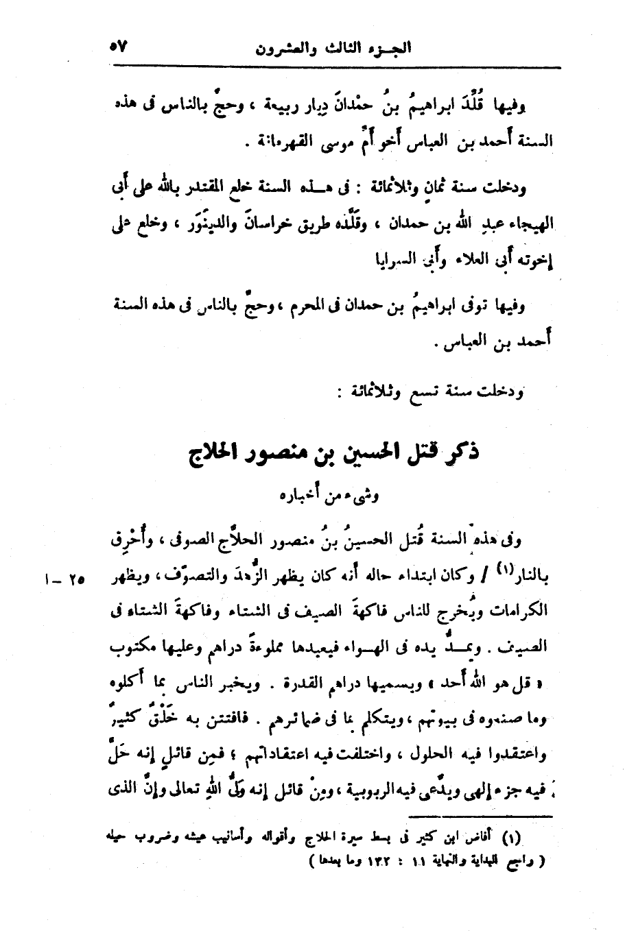 وشىء من أخباره وفى هذه السنة قتل الحسين بن منصور الحلّاج الصوفى، وأحرق بالنار «1» /وكان ابتداء حاله أنه كان يظهر الزّهد والتصوّف، ويظهر الكرامات ويخرج للناس فاكهة الصيف فى الشتاء وفاكهة الشتاء فى الصيف. ويمدّ يده فى الهواء فيعيدها مملوءة دراهم وعليها مكتوب «قل هو الله أحد» ويسميها دراهم القدرة. ويخبر الناس بما أكلوه وما صنعوه فى بيوتهم، ويتكلم بما فى ضمائرهم. فافتتن به خلق كثير واعتقدوا فيه الحلول، واختلفت فيه اعتقاداتهم؛ فمن قائل إنه حلّ فيه جزء إلهى ويدّعى فيه الربوبية، ومن قائل إنه ولىّ الله تعالى وإنّ الذى