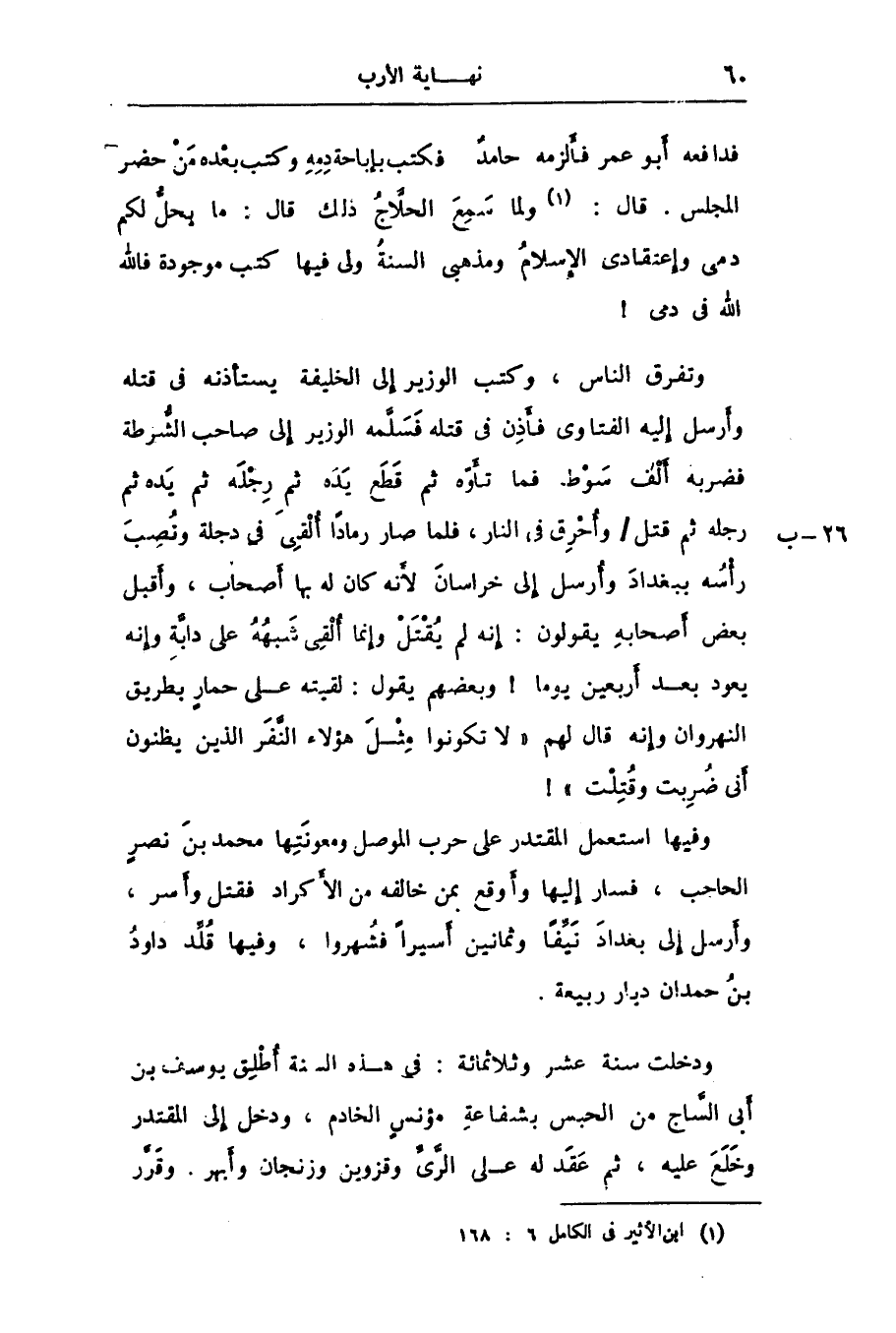 فدافعه أبو عمر فألزمه حامد فكتب بإباحة دمه وكتب بعده من حضر المجلس. قال: «1» ولما سمع الحلّاج ذلك قال: ما يحلّ لكم دمى وإعتقادى الإسلام ومذهبى السنة ولى فيها كتب موجودة فالله الله فى دمى! وتفرق الناس، وكتب الوزير إلى الخليفة يستأذنه فى قتله وأرسل إليه الفتاوى فأذن فى قتله فسلّمه الوزير إلى صاحب الشّرطة فضربه ألف سوط فما تأوّه ثم قطع يده ثم رجله ثم يده ثم رجله ثم قتل/ وأحرق فى النار، فلما صار رمادا ألقى فى دجلة ونصب رأسه ببغداد وأرسل إلى خراسان لأنه كان له بها أصحاب، وأقبل بعض أصحابه يقولون: إنه لم يقتل وإنما ألقى شبهه على دابّة وإنه يعود بعد أربعين يوما! وبعضهم يقول: لقيته على حمار بطريق النهروان وإنه قال لهم «لا تكونوا مثل هؤلاء النّفر الذين يظنون أنى ضربت وقتلت» ! وفيها استعمل المقتدر على حرب الموصل ومعونتها محمد بن نصر الحاجب، فسار إليها وأوقع بمن خالفه من الأكراد فقتل وأسر، وأرسل إلى بغداد نيّفا وثمانين أسيرا فشهروا، وفيها قلّد داود بن حمدان ديار ربيعة.