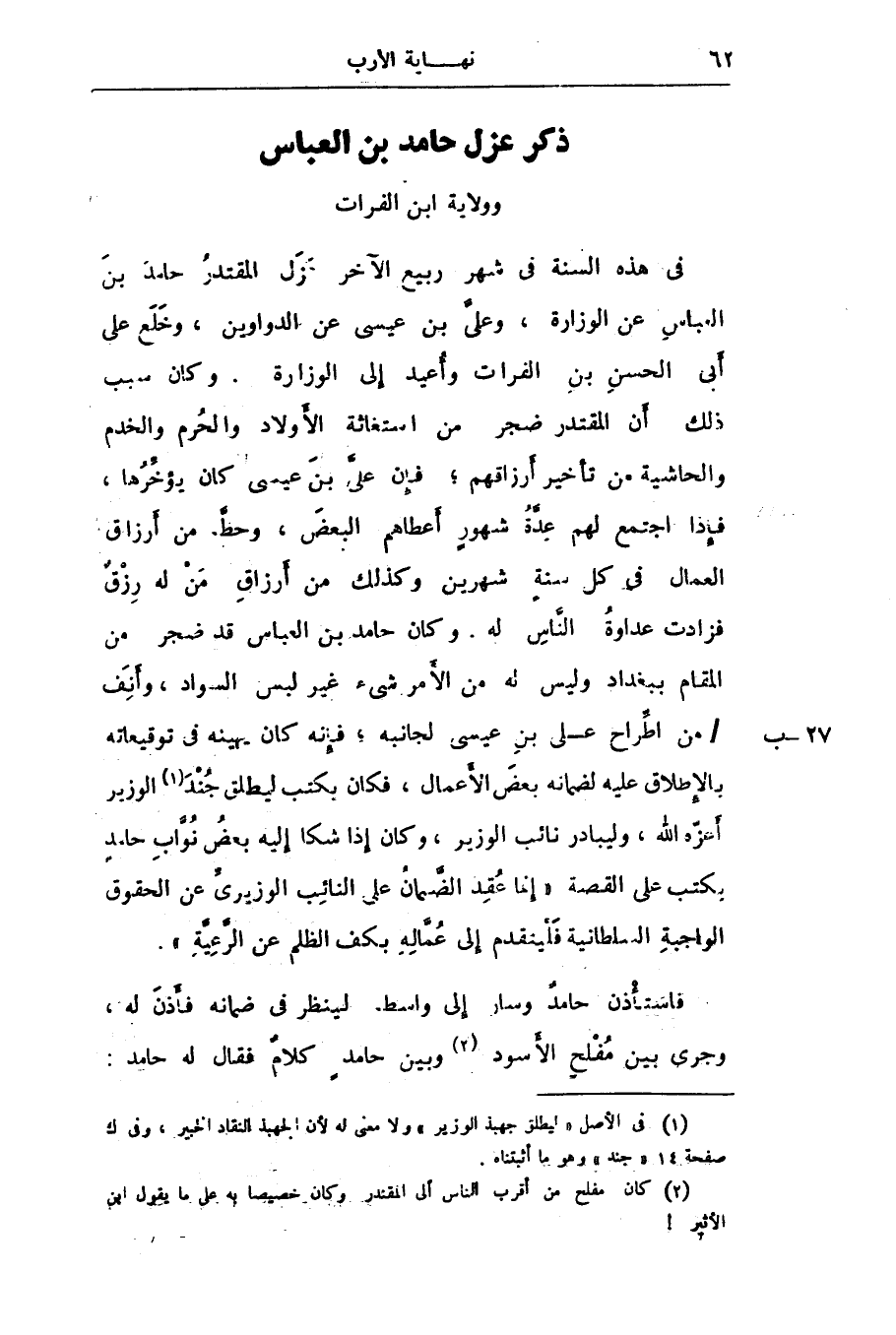 وولاية ابن الفرات فى هذه السنة فى شهر ربيع الآخر عزل المقتدر حامد بن العباس عن الوزارة، وعلىّ بن عيسى عن الدواوين، وخلع على أبى الحسن بن الفرات وأعيد إلى الوزارة. وكان سبب ذلك أن المقتدر ضجر من استغاثة الأولاد والحرم والخدم والحاشية من تأخير أرزاقهم؛ فإن علىّ بن عيسى كان يؤخّرها، فإذا اجتمع لهم عدّة شهور أعطاهم البعض، وحطّ من أرزاق العمال فى كل سنة شهرين وكذلك من أرزاق من له رزق فزادت عداوة النّاس له. وكان حامد بن العباس قد ضجر من المقام ببغداد وليس له من الأمر شىء غير لبس السواد، وأنف/ من اطّراح على بن عيسى لجانبه، فإنه كان يهينه فى توقيعاته بالإطلاق عليه لضمانه بعض الأعمال، فكان بكتب ليطلق جند «1» الوزير أعزّه الله، وليبادر نائب الوزير، وكان إذا شكا إليه بعض نوّاب حامد يكتب على القصة «إنما عقد الضّمان على النائب الوزيرىّ عن الحقوق الواجبة السلطانية فليتقدم إلى عمّاله بكف الظلم عن الرّعيّة» .