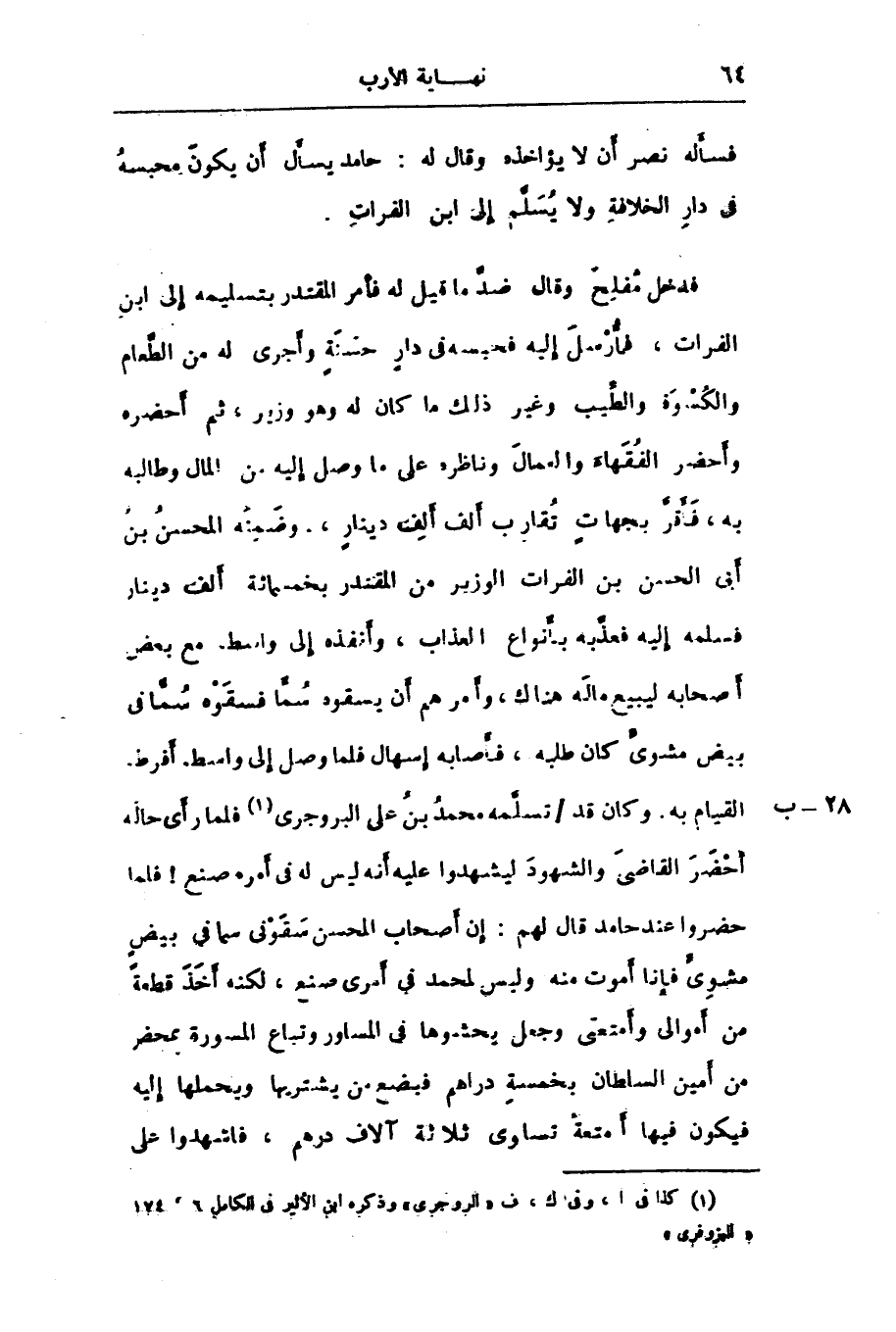 فسأله نصر أن لا يؤاخذه وقال له: حامد يسأل أن يكون محبسه فى دار الخلافة ولا يسلّم إلى ابن الفرات.