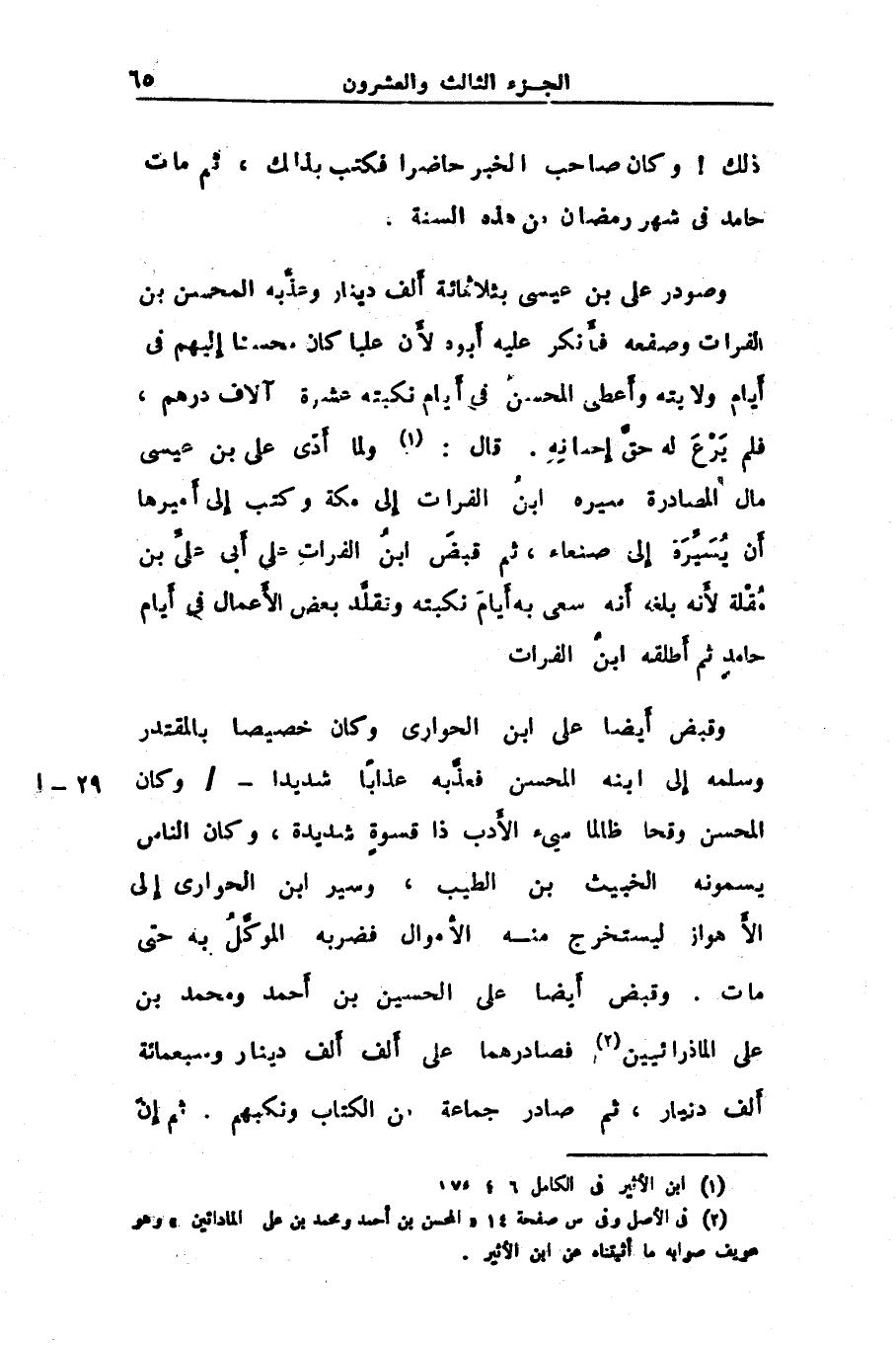 وصودر على بن عيسى بثلاثمائة ألف دينار وعذّبه المحسن بن الفرات وصفعه فأنكر عليه أبوه لأن عليا كان محسنا إليهم فى أيام ولايته وأعطى المحسن فى أيام نكبته عشرة آلاف درهم، فلم يرع له حقّ إحسانه. قال: «1» ولما أدّى على بن عيسى مال المصادرة سيره ابن الفرات إلى مكة وكتب إلى أميرها أن يسيّره إلى صنعاء، ثم قبض ابن الفرات على أبى علىّ بن مقلة لأنه بلغه أنه سعى به أيام نكبته ونقلّد بعض الأعمال فى أيام حامد ثم أطلقه ابن الفرات وقبض أيضا على ابن الحوارى وكان خصيصا بالمقتدر وسلمه إلى ابنه المحسن فعذّبه عذابا شديدا-/ وكان المحسن وقحا ظالما سيء الأدب ذا قسوة شديدة، وكان الناس يسمونه الخبيث بن الطيب، وسير ابن الحوارى إلى الأهواز ليستخرج منه الأموال فضربه الموكّل به حتى مات. وقبض أيضا على الحسين بن أحمد ومحمد بن على الماذرائيين «2» فصادرهما على ألف ألف دينار وسبعمائة ألف دنيار، ثم صادر جماعة من الكتاب ونكبهم. ثم إنّ