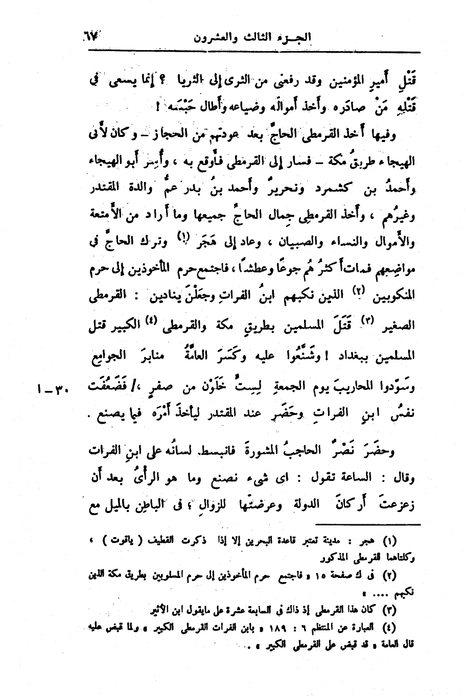 قتل أمير المؤمنين وقد رفعنى من الثرى إلى الثريا؟ إنما يسعى فى قتله من صادره وأخذ أمواله وضياعه وأطال حبسه! وفيها أخذ القرمطى الحاجّ بعد عودتهم من الحجاز- وكان لأبى الهيجاء طريق مكة- فسار إلى القرمطى فأوقع به، وأسر أبو الهيجاء وأحمد بن كشمرد ونحرير وأحمد بن بدر عمّ والدة المقتدر وغيرهم، وأخذ القرمطى جمال الحاجّ جميعها وما أراد من الأمتعة والأموال والنساء والصبيان، وعاد إلى هجر «1» وترك الحاجّ فى مواضعهم فمات أكثرهم جوعا وعطشا، فاجتمع حرم المأخوذين إلى حرم المنكوبين «2» الذين نكبهم ابن الفرات وجعلن ينادين: القرمطى الصغير «3» قتل المسلمين بطريق مكة والقرمطى «4» الكبير قتل المسلمين ببغداد! وشنّعوا عليه وكسر العامّة منابر الجوامع وسوّدوا المحاريب يوم الجمعة لستّ خلون من صفر،/ فضعفت نفس ابن الفرات وحضر عند المقتدر ليأخذ أمره فيما يصنع.