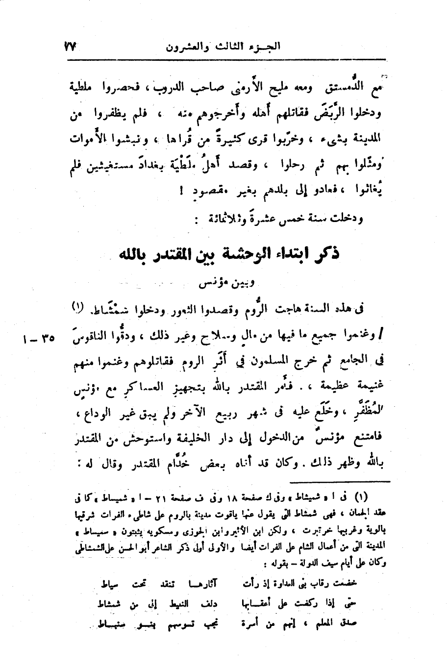 فى هذه السنة هاجت الرّوم وقصدوا الثعور ودخلوا شمشاط «1» /وغنموا جميع ما فيها من مال وسلاح وغير ذلك، ودقّوا الناقوس فى الجامع ثم خرج المسلمون فى أثر الروم فقاتلوهم وغنموا منهم غنيمة عظيمة، فأمر المقتدر بالله بتجهيز العساكر مع مؤنس المظفّر، وخلع عليه فى شهر ربيع الآخر ولم يبق غير الوداع، فامتنع مؤنس من الدخول إلى دار الخليفة واستوحش من المقتدر بالله وظهر ذلك. وكان قد أتاه بعض خدّام المقتدر وقال له: