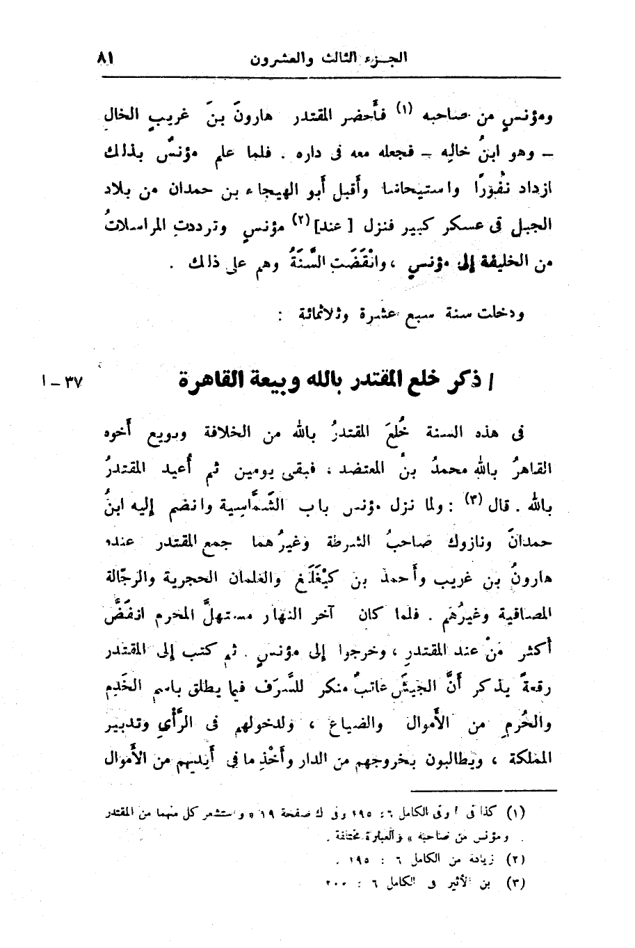 فى هذه السنة خلع المقتدر بالله من الخلافة وبويع أخوه القاهر بالله محمد بن المعتضد، فبقى يومين ثم أعيد المقتدر بالله. قال «3» : ولما نزل مؤنس باب الشمّاسية وانضم إليه ابن حمدان ونازوك صاحب الشرطة وغيرهما جمع المقتدر عنده هارون بن غريب وأحمد بن كيغلغ والغلمان الحجرية والرجّالة المصافية وغيرهم. فلما كان آخر النهار مستهلّ المحرم انفضّ أكثر من عند المقتدر، وخرجوا إلى مؤنس. ثم كتب إلى المقتدر رقعة يذكر أنّ الجيش عاتب منكر للسّرف فيما يطلق باسم الخدم والحرم من الأموال والضياع، ولدخولهم فى الرّأى وتدبير المملكة، ويطالبون بخروجهم من الدار وأخذ ما فى أيديهم من الأموال