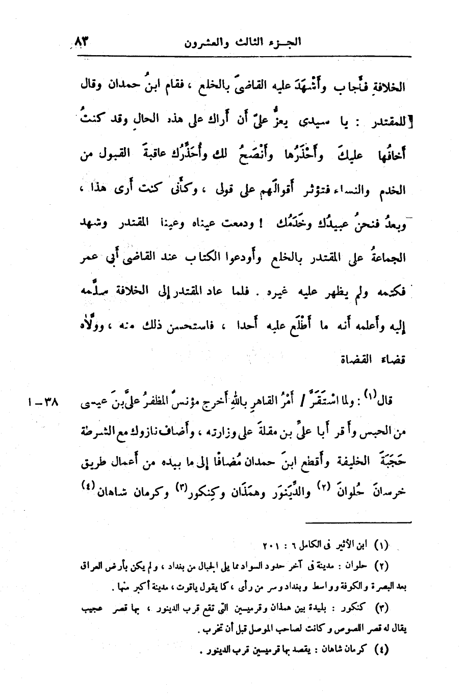 الخلافة فأجاب وأشهد عليه القاضى بالخلع، فقام ابن حمدان وقال للمقتدر: يا سيدى يعزّ علىّ أن أراك على هذه الحال وقد كنت أخافها عليك وأحذرها وأنصح لك وأحذّرك عاقبة القبول من الخدم والنساء فتؤثر أقوالهم على قولى، وكأنى كنت أرى هذا، وبعد فنحن عبيدك وخدمك! ودمعت عيناه وعينا المقتدر وشهد الجماعة على المقتدر بالخلع وأودعوا الكتاب عند القاضى أبى عمر فكتمه ولم يظهر عليه غيره. فلما عاد المقتدر إلى الخلافة سلّمه إليه وأعلمه أنه ما أطلع عليه أحدا، فاستحسن ذلك منه، وولّاه قضاء القضاة قال «1» : ولما استقرّ/ أمر القاهر بالله أخرج مؤنس المظفر علىّ بن عيسى من الحبس وأقر أبا علىّ بن مقلة على وزارته، وأضاف نازوك مع الشرطة حجبة الخليفة وأقطع ابن حمدان مضافا إلى ما بيده من أعمال طريق خرسان حلوان «2» والدّينور وهمذان وكنكور «3» وكرمان شاهان «4»