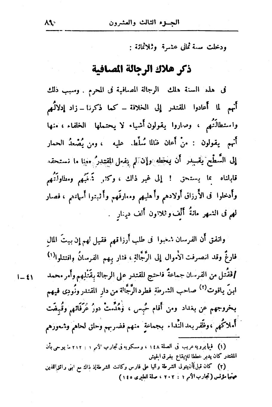 فى هذه السنة هلك الرجالة المصافية فى المحرم. وسبب ذلك أنهم لما أعادوا المقتدر إلى الخلافة- كما ذكرنا- زاد إدلالهم واستطالتهم، وصاروا يقولون أشياء لا يحتملها الخلفاء، منها أنهم يقولون: من أعان ظالما سلّط عليه، ومن يصعد الحمار إلى السّطح يقدر أن يحطه وإن لم يفعل المقتدر معنا ما نستحقه قابلناه بما يستحق! إلى غير ذلك، وكثر شغبهم ومطاولتهم وأدخلوا فى الأرزاق أولادهم وأهليهم ومعارفهم وأثبتوا أسماءهم، فصار لهم فى الشهر مائة ألف وثلاثون ألف دينار.