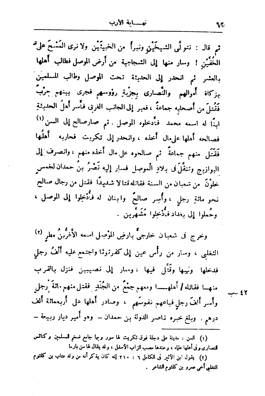 وخرج فى شعبان خارجىّ بارض الموصل اسمه الأغرّبن مطر «2» الثغلبى، وسار من رأس عين إلى كفرتوثا واجتمع عليه ألف رجل فدخلها ونهبها وقتّل فيها، وسار إلى نصيبين فنزل بالقرب منها فقاتله/ أهلها ومعهم جمع من الجند فقتل منهم مائة رجل وأسر ألف رجل فباعهم نفوسهم، وصادر أهلها على أربعمائة ألف درهم. وبلغ خبره ناصر الدولة بن حمدان- وهو أمير ديار ربيعة-
