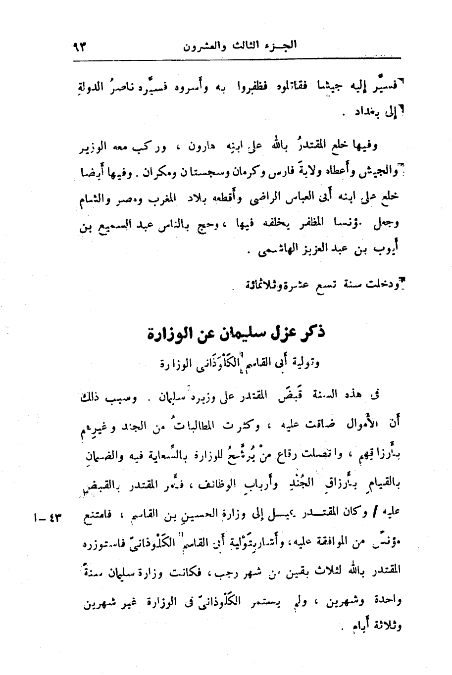 وتولية أبى القاسم الكلوذانى الوزارة فى هذه السنة قبض المقتدر على وزيره سليمان. وسبب ذلك أن الأموال ضاقت عليه، وكثرت المطالبات من الجند وغيرهم بأرزاقهم، واتصلت رقاع من يرشّح للوزارة بالسّعاية فيه والضمان بالقيام بأرزاق الجند وأرباب الوظائف، فأمر المقتدر بالقبض عليه/ وكان المقتدر يميل إلى وزارة الحسين بن القاسم، فامتنع مؤنس من الموافقة عليه، وأشار بتولية أبى القاسم الكلوذانىّ فاستوزره المقتدر بالله لثلاث بقين من شهر رجب، فكانت وزارة سليمان سنة واحدة وشهرين، ولم يستمر الكلوذانىّ فى الوزارة غير شهرين وثلاثة أيام.